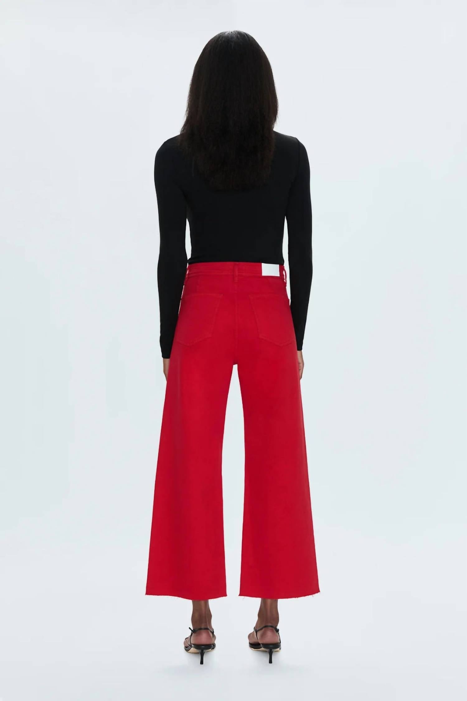 High-waist is here to stay and we especially love this style. Introducing the Pistola Penny High Rise Wide Leg Jeans in a captivating ruby red, perfect for the maximalist trend. These jeans boast a comfortable yet structured fit with a 12" high rise waist and a wide leg with a 21" opening, crafted from a 99% Cotton and 1% Elastane blend. The design features a 27" inseam, a scissor-cut hem for an edgy finish, and a convenient button closure. Ideal for vacation or holiday styling, these jeans are easy care with machine wash and tumble dry instructions.