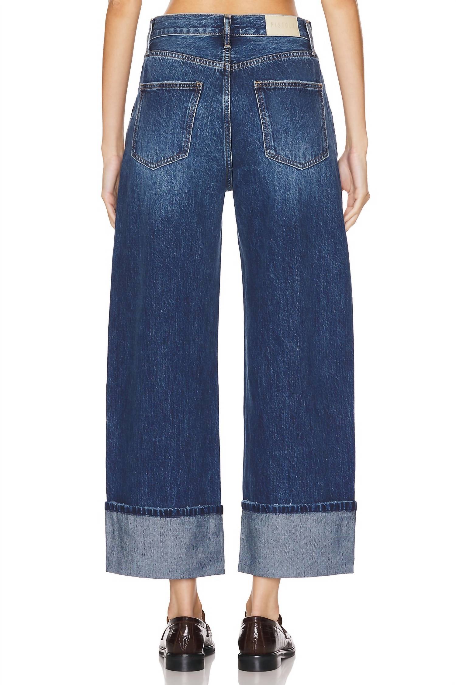 Elevate your denim collection with the Ryder High Rise Cuffed Jean by PISTOLA in the vintage-inspired Fulton hue. These jeans feature a high rise waist and a relaxed straight leg with an oversized cuffed ankle hem, crafted from rigid, lightweight 100% Cotton denim. Closure is conveniently secured with a button closure, ensuring style and practicality. Designed with a rise of 12", an inseam of 27", and a leg opening of 19", these jeans perfectly capture a classic yet contemporary look. Care: Machine wash. Model Bridget is 5'8" and wearing a size 24 with a 24" waist, 34" bust, and 34" hips.