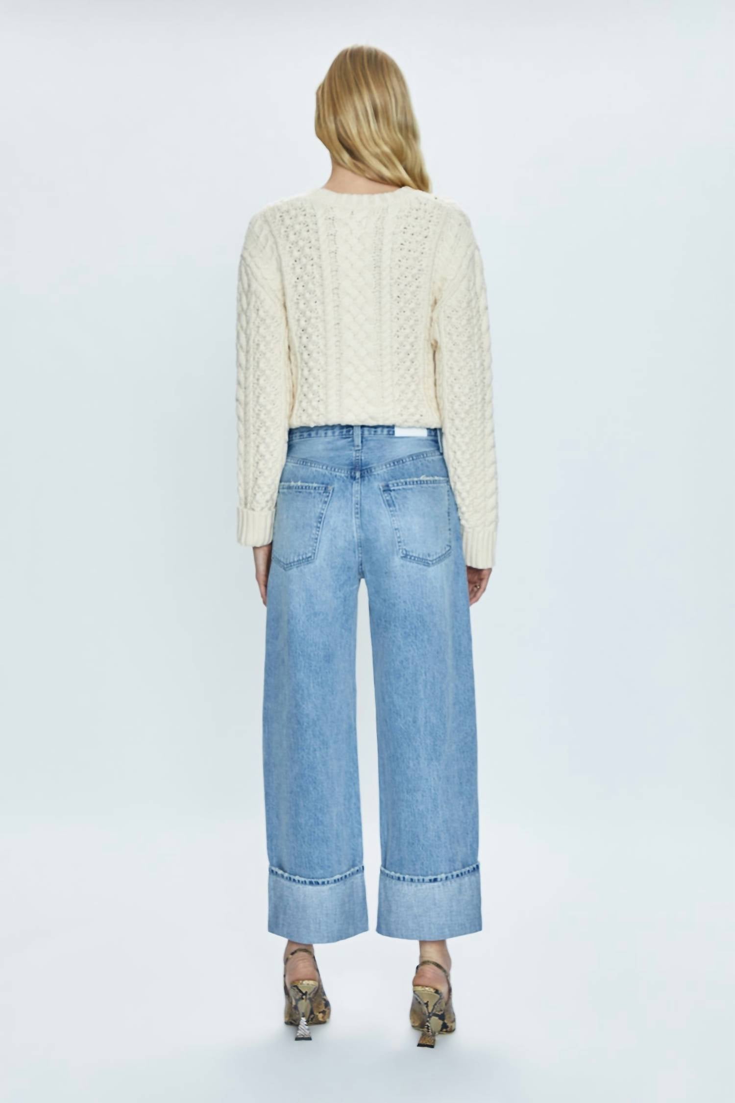 A flattering silhouette that's suprisingly versatile. Introducing the Ryder Wide Leg Jeans by PISTOLA, your new favorite denim in a captivating Essex Vintage wash. These high-rise jeans boast a relaxed fit with a 27" inseam and wide-leg style, finished with an oversized cuffed ankle hem. Expertly crafted from 100% cotton, they exude a vintage-inspired look with subtle fading and whiskering. Closure: Zip closure. Care: Machine wash, tumble dry. Model is 5’9” and wears size 26, with a rise of 12" and a leg opening of 19".