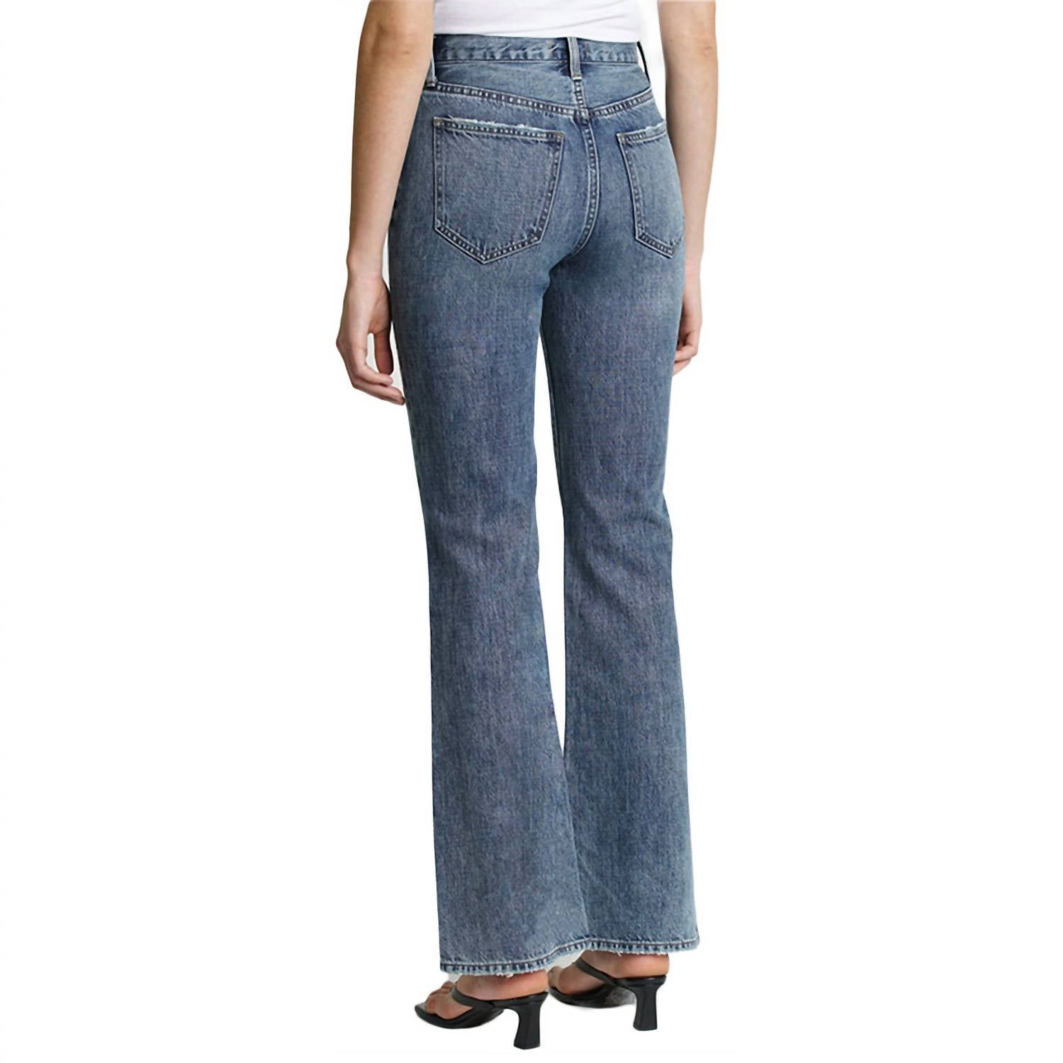 A flattering silhouette that's suprisingly versatile. A wide leg, high rise jean with a minimal fray detailing. Scissor cut hem. Materials: 75% Cotton 25% Rayon. Wash cold.