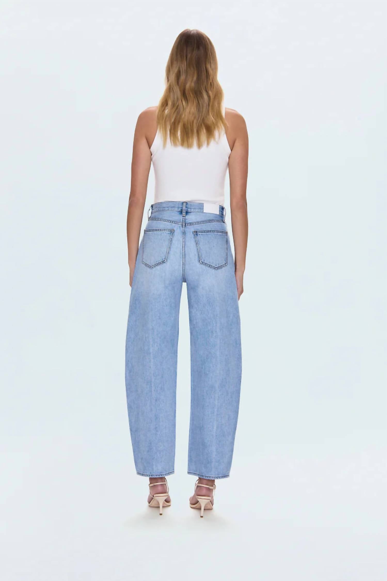 Introducing the Wes High-rise Jean by PISTOLA, your new essential for a modern denim look in Gaze. These jeans, crafted from premium 100% cotton, boast a flattering high-rise waist and a full-length 30" inseam. Designed with a stylish barrel leg silhouette, they feature a relaxed fit and a leg opening of 16 1/2 inches, creating a sophisticated yet versatile addition to your wardrobe. Closure: Zip closure. Origin: Imported. Care: Machine wash and tumble dry.