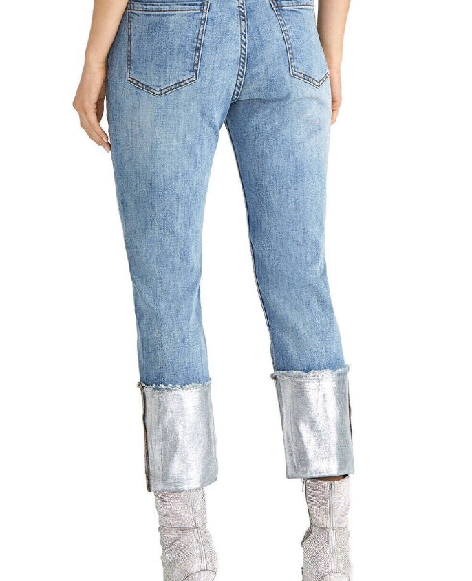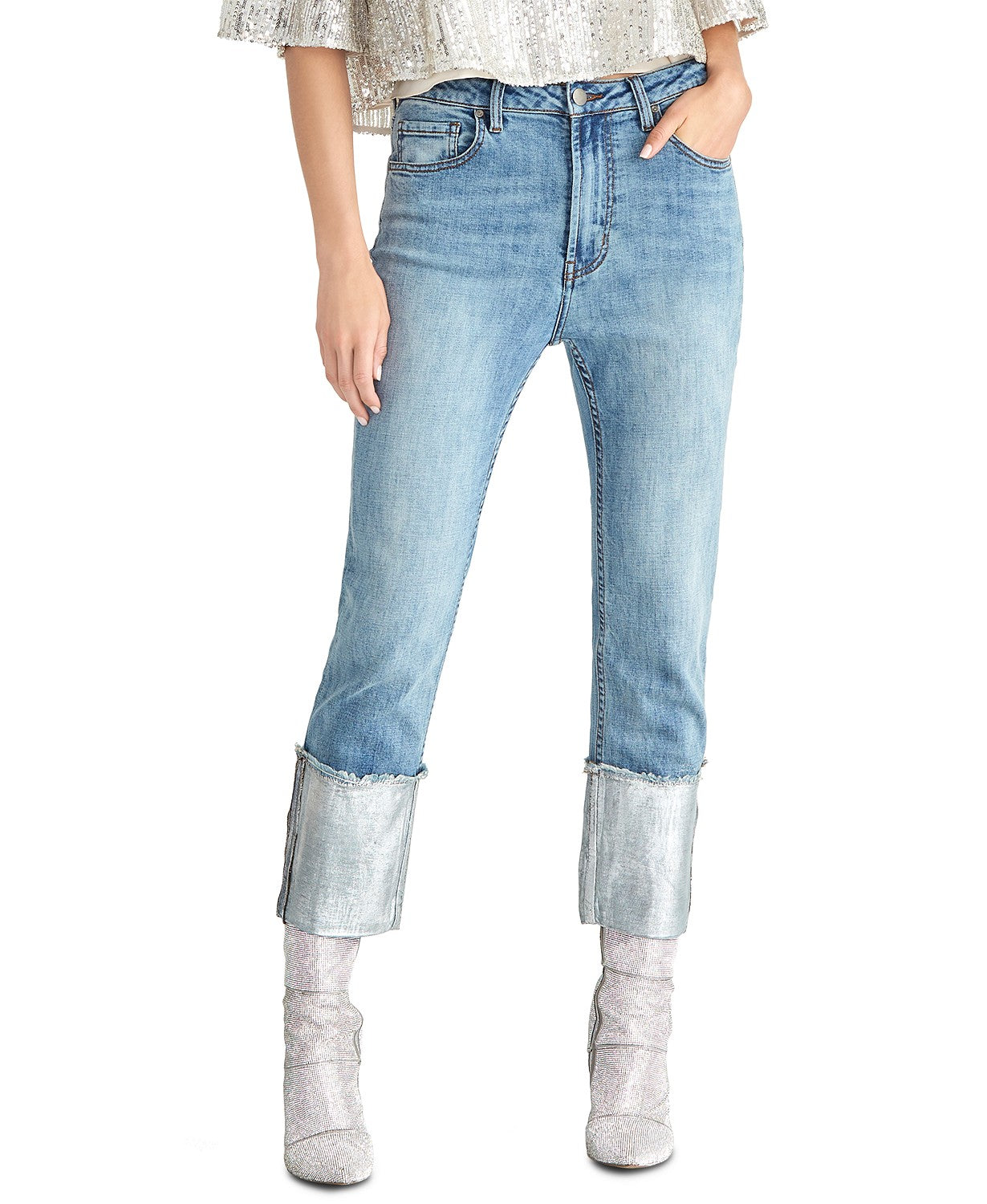 Approx. inseam: 25"|High rise|Zipper and button closure at front; belt loops|Metallic coating at cuffs