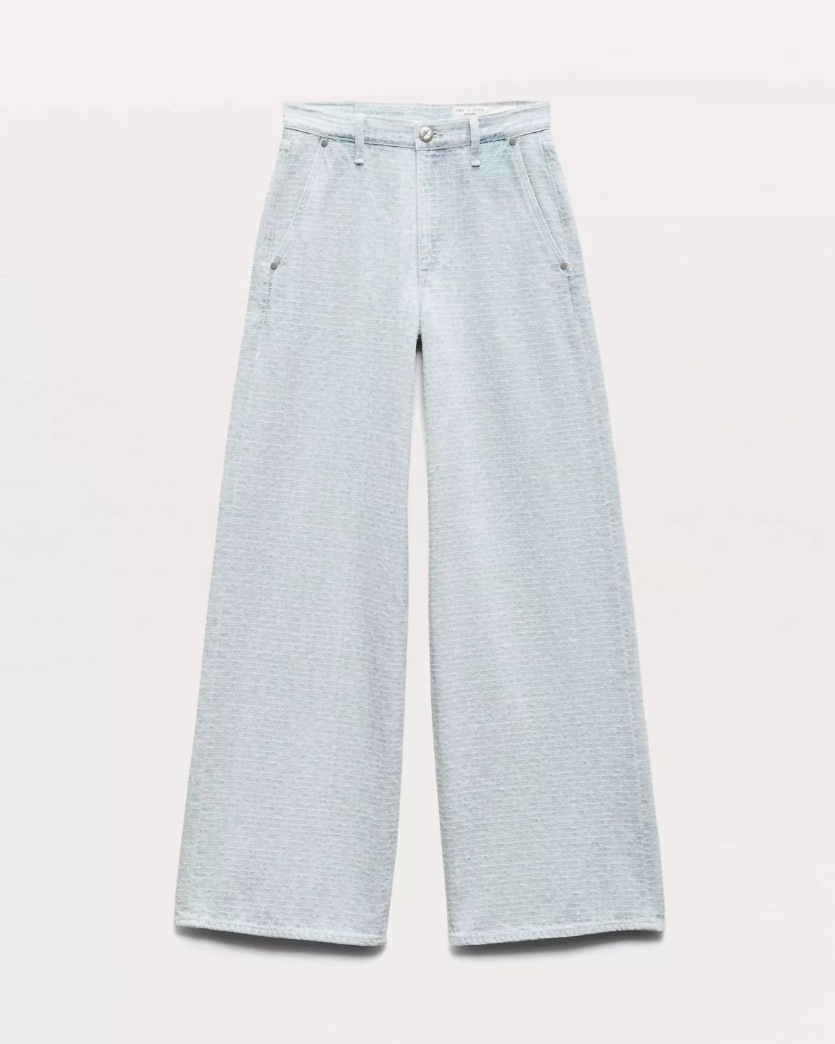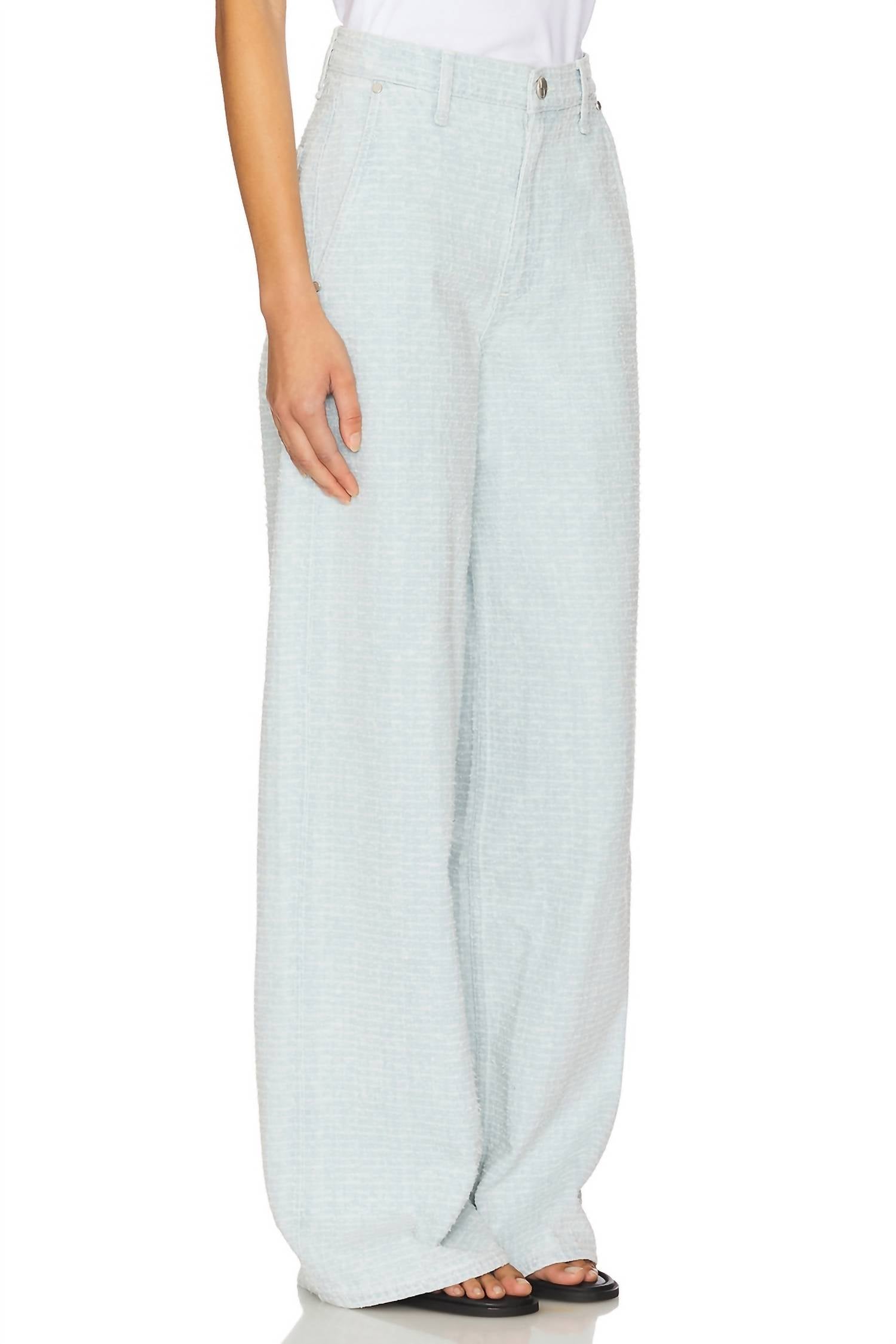 Elevate your wardrobe with the Sofie High Rise Tailored Trouser Jeans by Rag & Bone in a textured Sky Blue Tweed. These trousers feature a structured design with a high-rise and relaxed fit, coupled with a wide leg style measuring 61 cm at the knee, tapering to 58 cm at the leg opening. They are crafted from 100% Cotton lightweight rigid denim that softens over time, with practical front slant and back welt pockets. Made in Turkey, these jeans come with a classic zip fly and button closure, designed for easy machine wash maintenance. Inseam measures 32.5", and the rise is 12".
