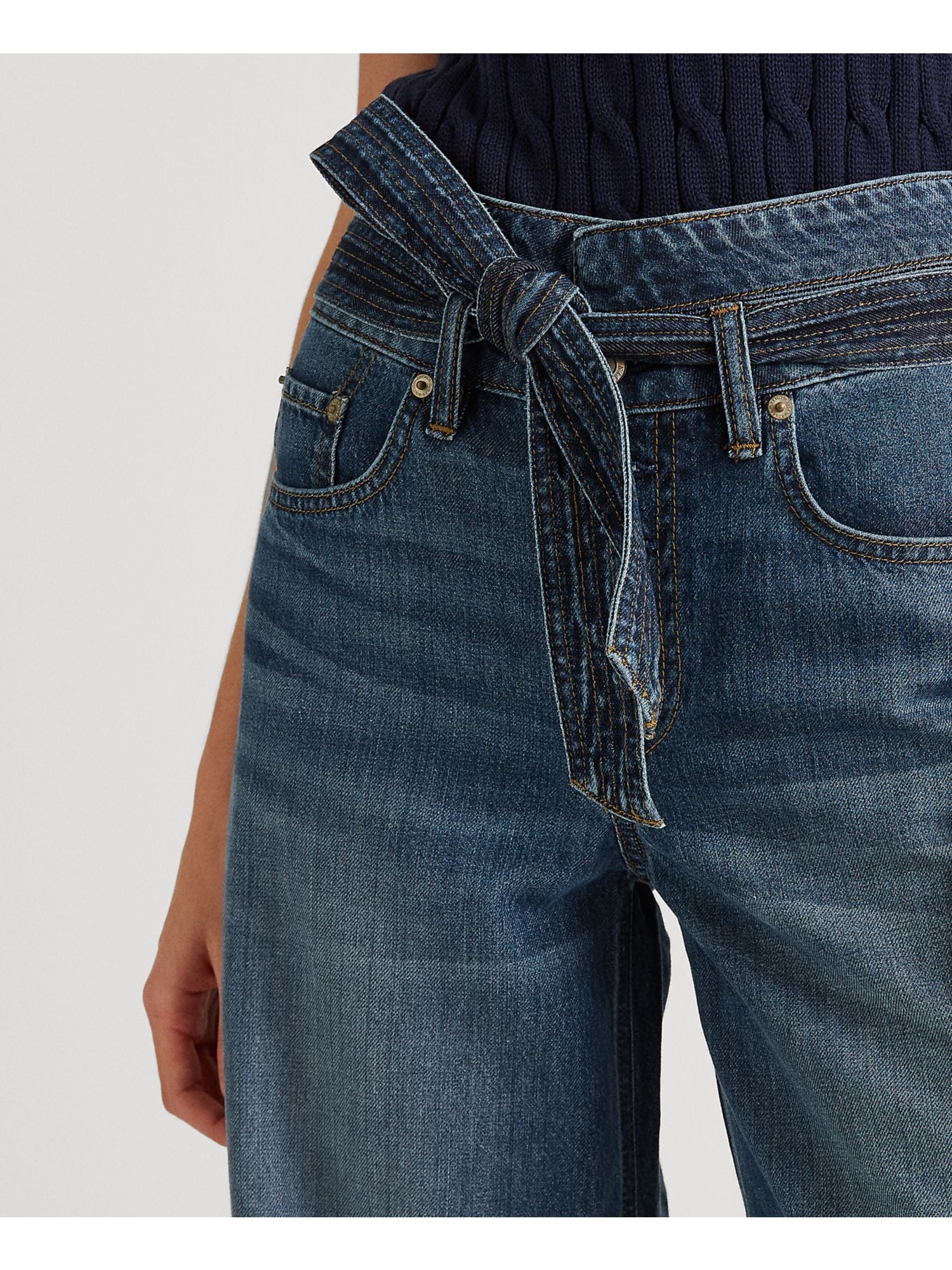 Ralph Lauren Women's Denim Pocketed Straight Leg Button Fly Tie Belt High Waist Jeans Blue Size 18
