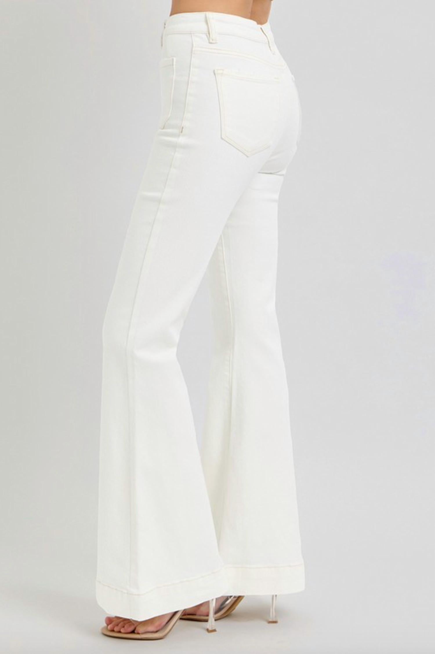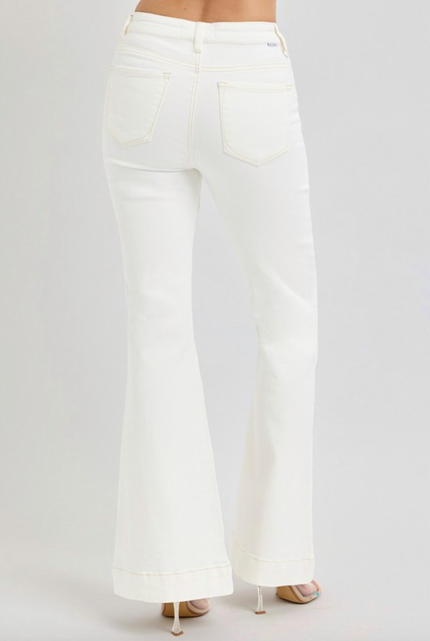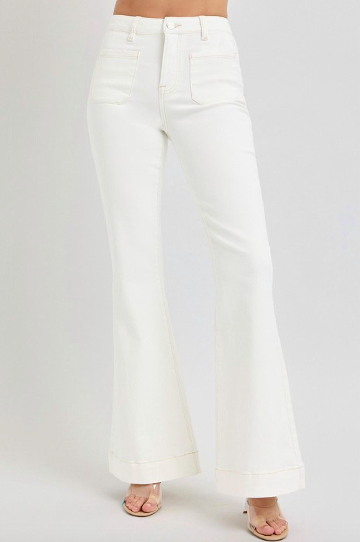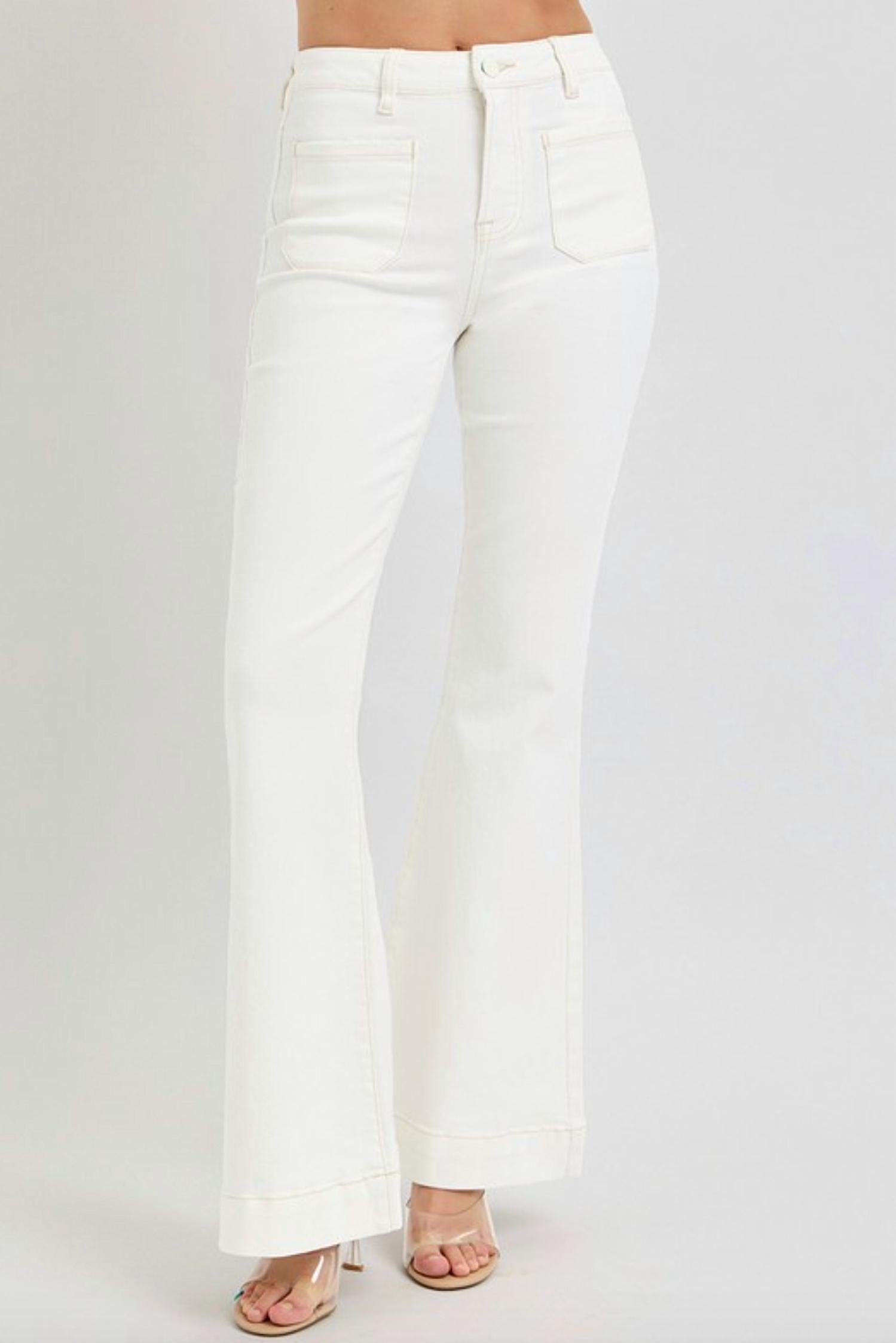 Just as cute as they are comfortable. Introducing the Patch Pocket Flare Jeans by RISEN, crafted in a comfortable cream cotton blend with 98% Cotton and 2% Spandex. These high-rise jeans feature a classic flared leg and practical patch pockets, making them perfect for any stylish occasion. With a 10 1/2" rise and a 33" inseam, they boast a relaxed fit and a button closure for easy wear. Care instructions: Machine wash. Model wears size 1 (5'8" height, 24" waist, 34" hips).