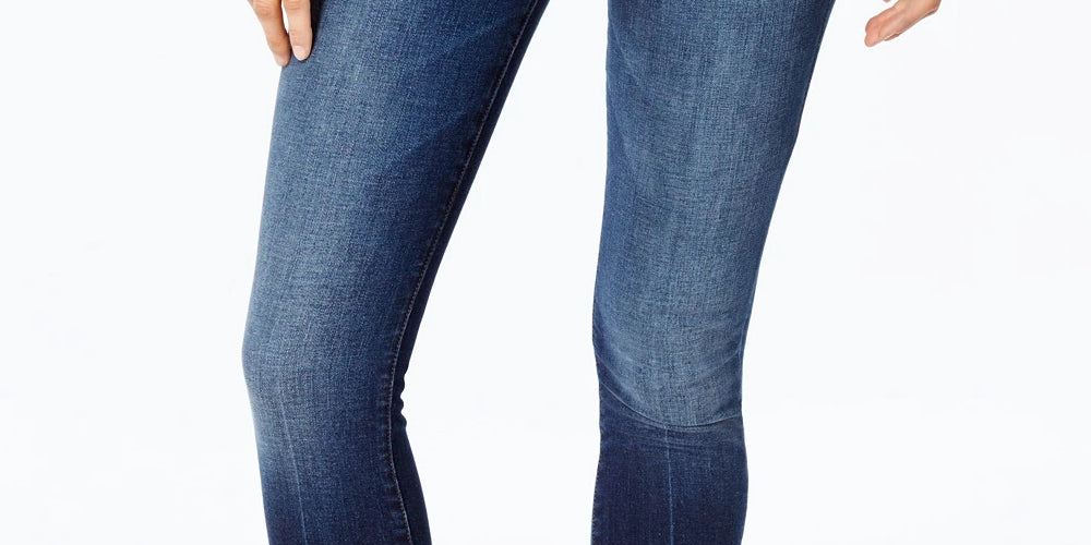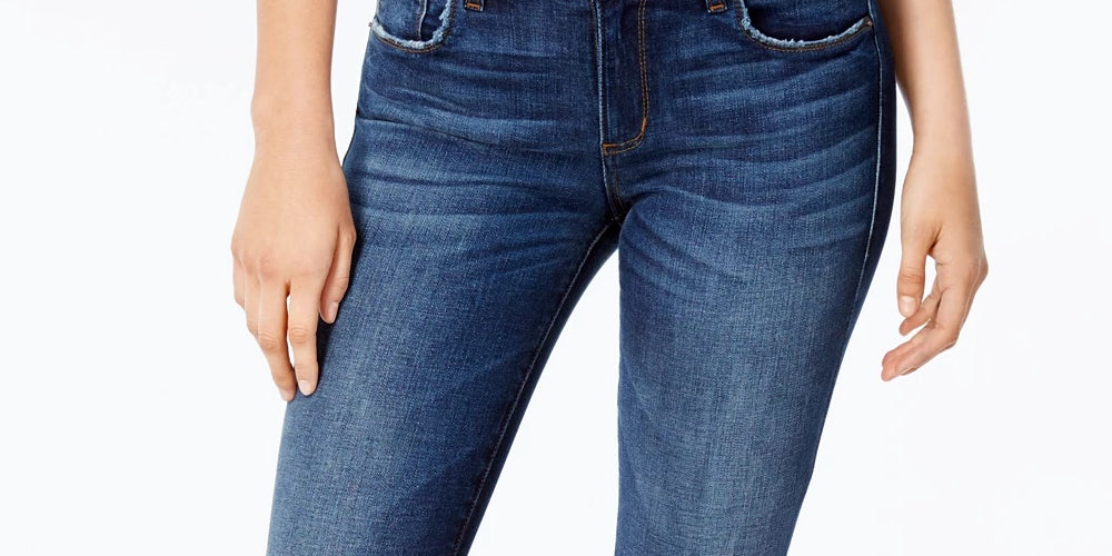 Mid rise; stretch slim fit through hips and thighs; skinny leg|Approx. inseam: 26"|Zipper and button closure; belt loops|Classic 5-pocket styling|Raw frayed hems|Dark wash with fading and whiskering