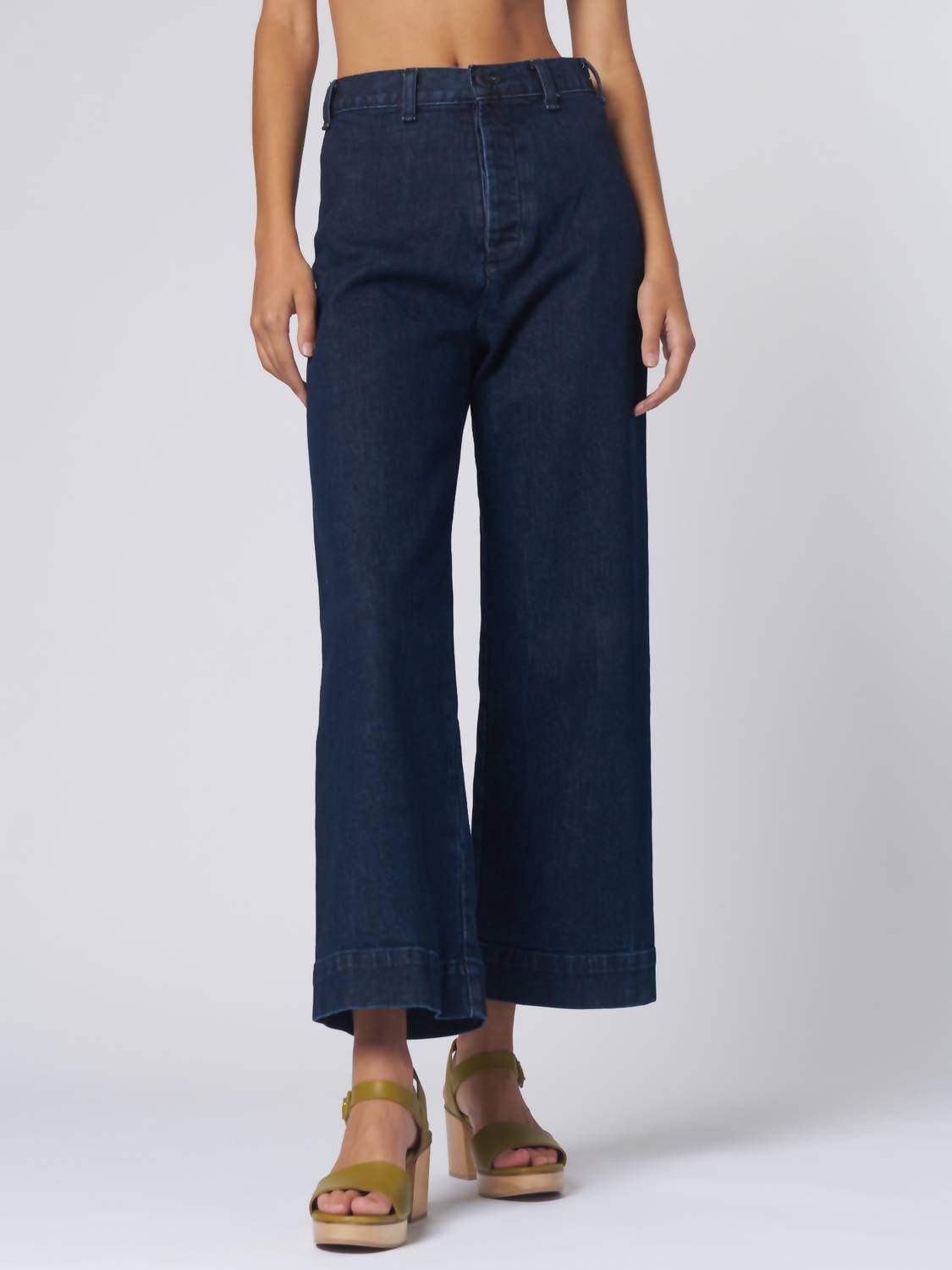 A flattering silhouette that's suprisingly versatile. Introducing The Seafair Jean by THE GREAT., a distinctive pair crafted from a durable cotton blend in a solid rodeo color, designed for style and comfort. These ultra-high-rise jeans offer a slim fit through the hips and flare into a wide leg, adorned with authentic darts, workwear pockets, and a button front fly. Composed of 98% cotton and 2% elastane, they are made in the U.S.A. Button closure. Machine wash cold, tumble dry low.