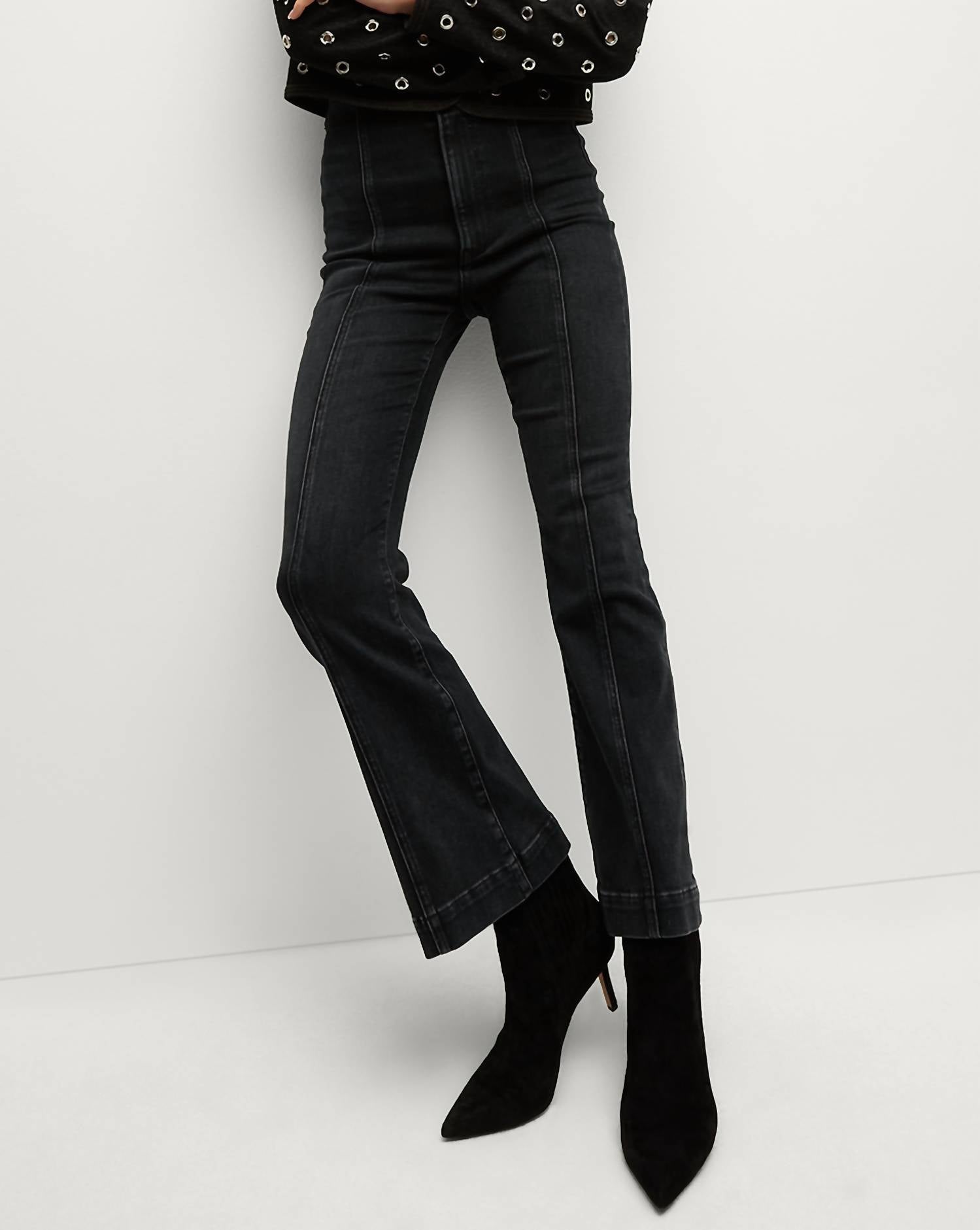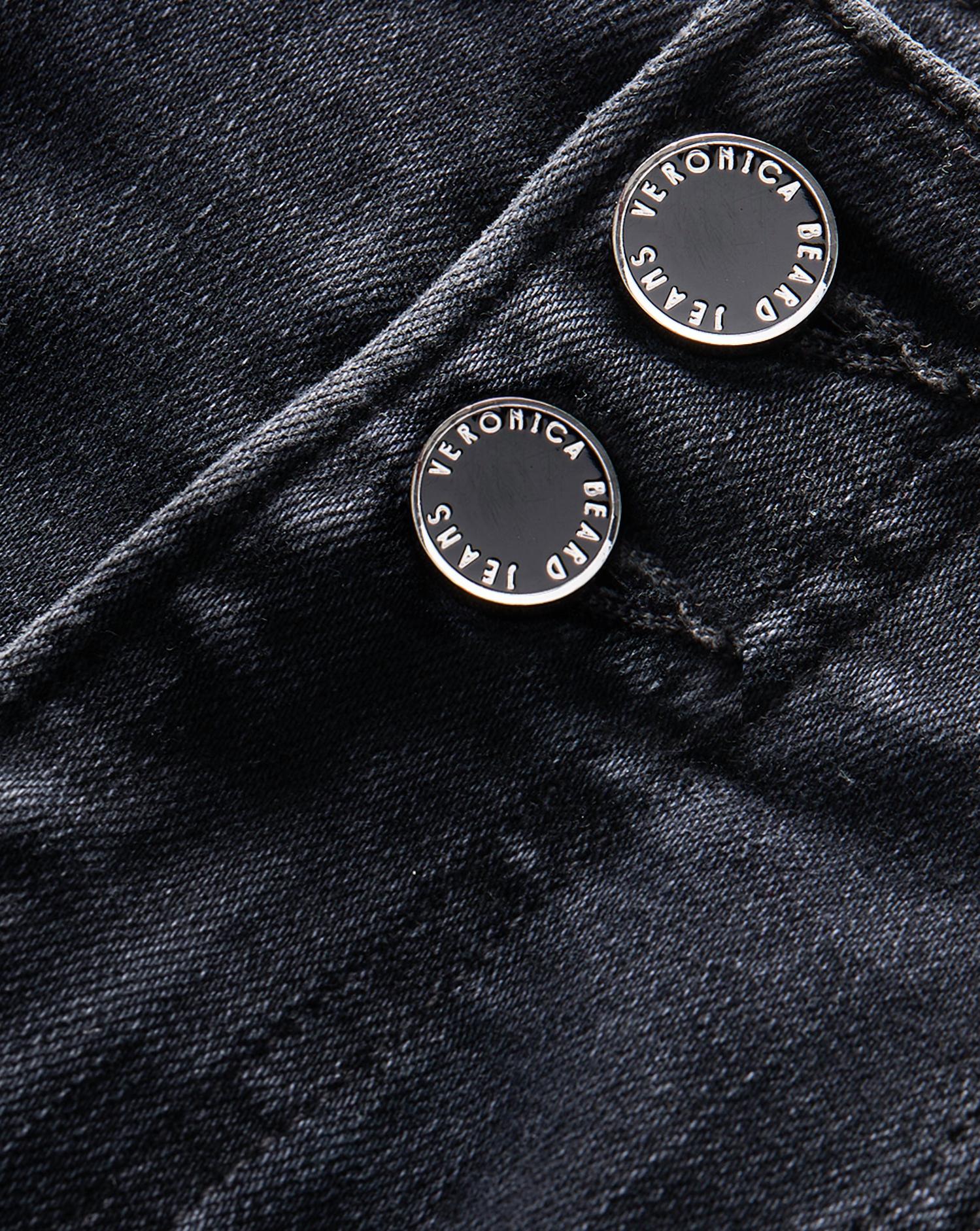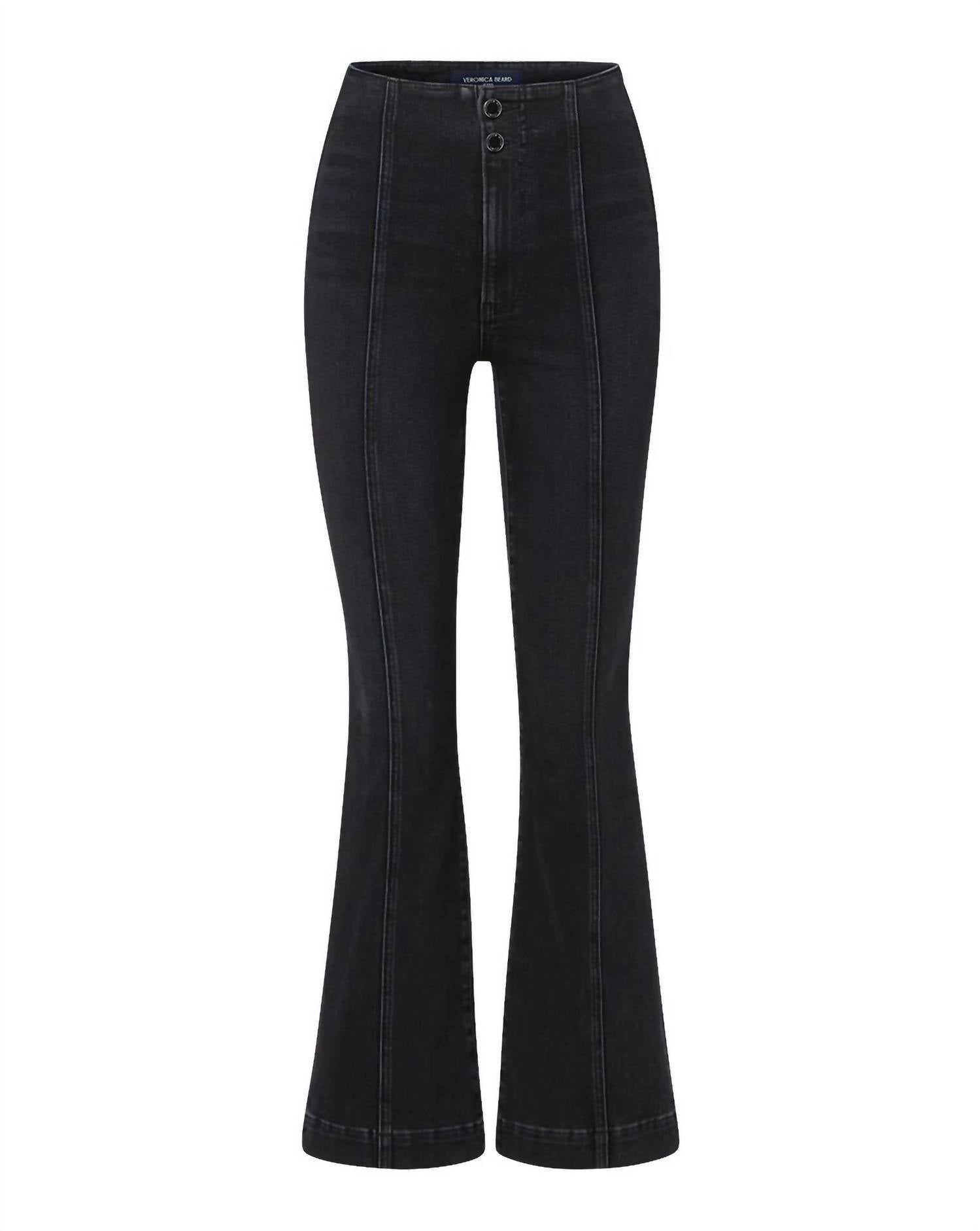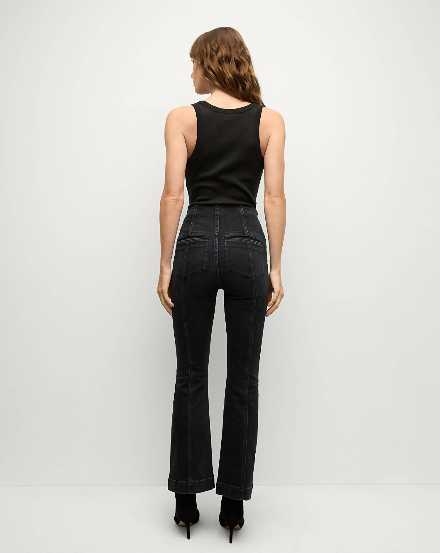 Pair these wide leg jeans with mules, slides or your favorite strappy sandals. Introducing the Carson Ankle Flare Jeans by Veronica Beard, a chic choice in washed onyx for modern style enthusiasts. These high-rise jeans feature a relaxed fit with a flared leg and are made from a super-stretch Turkish cotton blend for ultimate comfort. Crafted in Los Angeles, they boast a button closure and Hollywood waist, making them perfect for elongating the legs with a 12" rise and 28" inseam. Care for them by turning inside out, machine washing cold, and hanging to dry. Model wears size 26, and it's advised to size up, as these jeans run small.