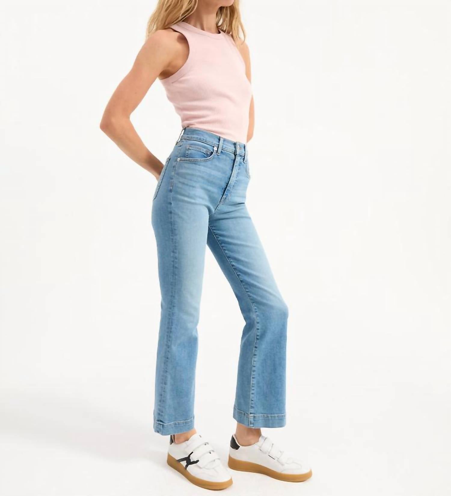 Just as cute as they are comfortable. Discover the Carson High Rise Ankle Flare Jeans by Veronica Beard, a sleek choice for the modern wardrobe. This stylish pair, made from super-stretch Italian denim, is crafted in LA and features a flattering high-rise fit through the hips and thighs, opening up to a slightly flared leg. Composition: 92% Cotton, 6% Elastomultiester, 2% Elastane. Closure: Zip closure. Care: Turn inside out and machine wash cold, line dry. Dimensions: Rise 11", Inseam 28", Leg opening 19", based on a size 26. Our model is 5'10" and wears size 26.