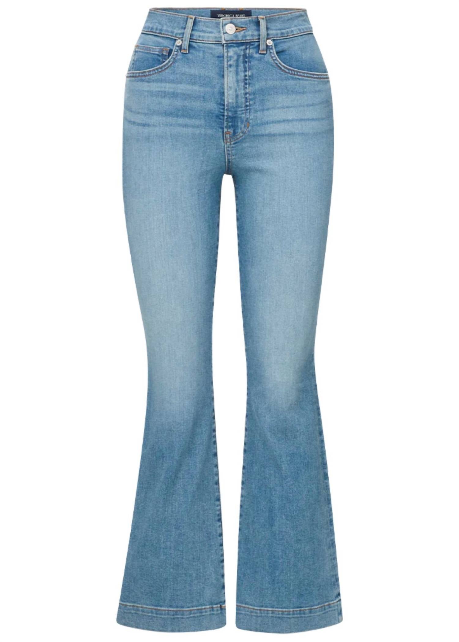 Discover the Carson High Rise Ankle Flare Jeans by Veronica Beard, a sleek choice for the modern wardrobe. This stylish pair, made from super-stretch Italian denim, is crafted in LA and features a flattering high-rise fit through the hips and thighs, opening up to a slightly flared leg. Composition: 92% Cotton, 6% Elastomultiester, 2% Elastane. Closure: Zip closure. Care: Turn inside out and machine wash cold, line dry. Dimensions: Rise 11", Inseam 28", Leg opening 19", based on a size 26. Our model is 5'10" and wears size 26.