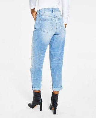 INC International Concepts Women's High Rise Ripped Leopard Boyfriend Jeans Blue Size 10