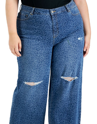 INC International Concepts Women's Cheetah Print Destructed Wide Leg Jeans Blue Size 18W