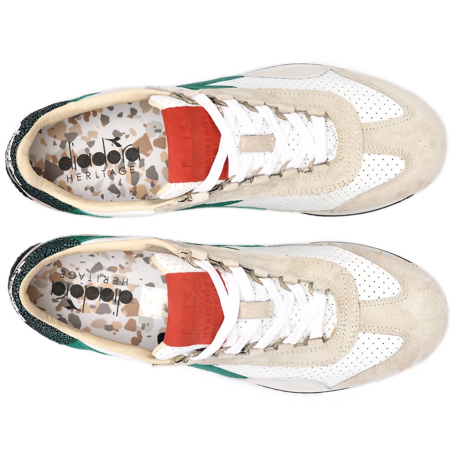 Explore the Men's Equipe Italia Sneakers by Diadora, a stylish nod to the brand's 90's athletic heritage. Crafted in Italy, these sneakers feature leather and suede uppers with signature branding at the heel and vibrant green and red detailing. Equipped with a round toe and a step-propelling rubber outsole, they ensure comfort with a flat heel design.