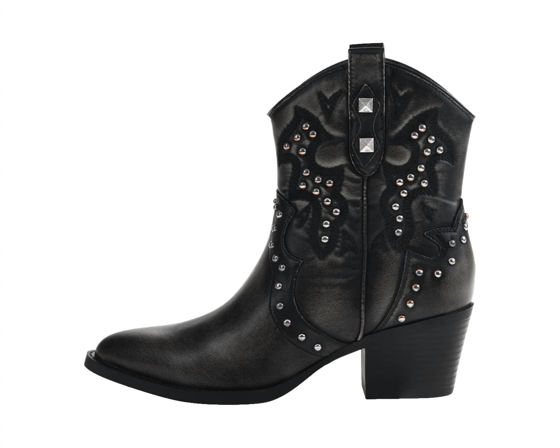 Say hello to the perfect, most versatile boot. The ankle height makes this style easily transition from day to night. Wear them with your favorite skinny jeans and tee for a more laid back look, or pair them with your favorite mini dress and jacket for a night out on the town. Step into bold style with the Nowhere Western Bootie by Dirty Laundry, a perfect blend of Western charm and edgy grunge. Crafted from sleek black synthetic leather, this bootie features polished studs and a pointed toe for a modern silhouette. The 2 1/4 inch stacked block heel combines style and comfort, while pull tabs ensure easy wear. Ideal for adding a rebellious flair to any outfit, this women's ankle bootie is a statement piece for any wardrobe.