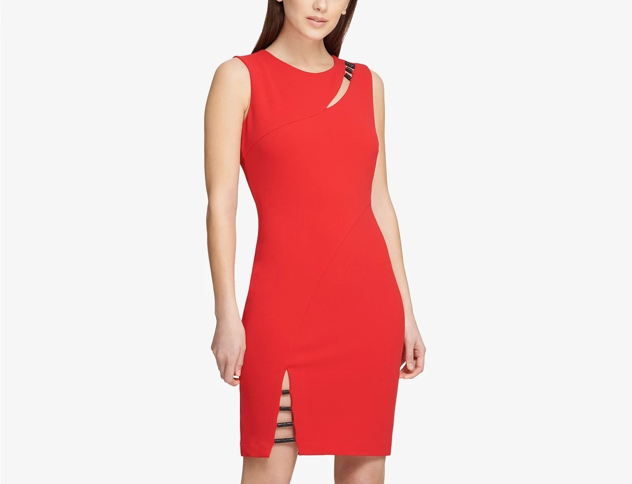 Approx. 36-3/5" long from center back to hem. Length is based on size 4 and varies 1/4" between sizes|Hits above the knee|Crew neckline; Sheath silhouette|Back zipper closure|Cutout at shoulder; slit at front hem