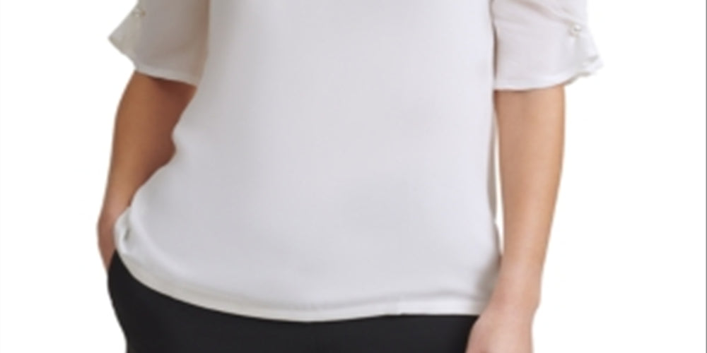 DKNY Women's Imitation Pearl Trim Elbow Sleeve Top White Size Medium