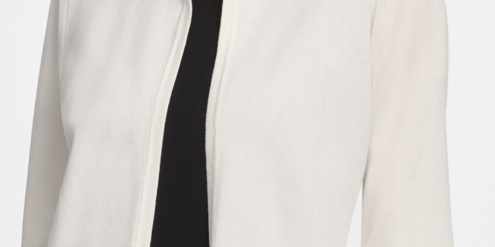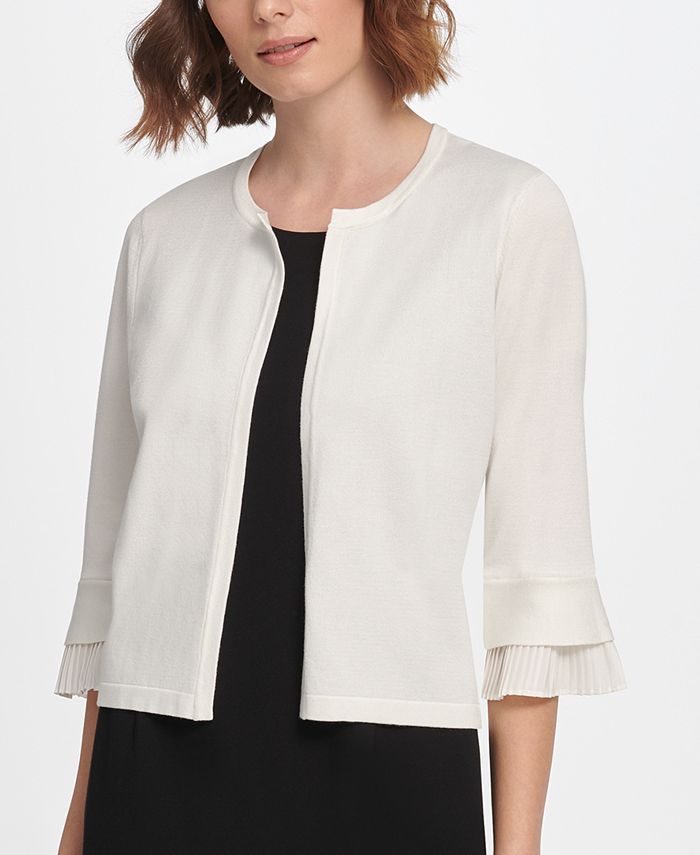 DKNY updates its open-front cardigan with a versatile 3/4-sleeve| featuring a bell sleeve with chiffon pleating.| Approx. 19.5 long from center back neck to hem. Length is based on size S and varies 1/4 between sizes.| Open front| Body; rayon/polyester; sleeve; polyester| Hand wash