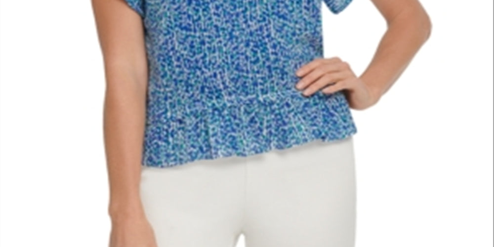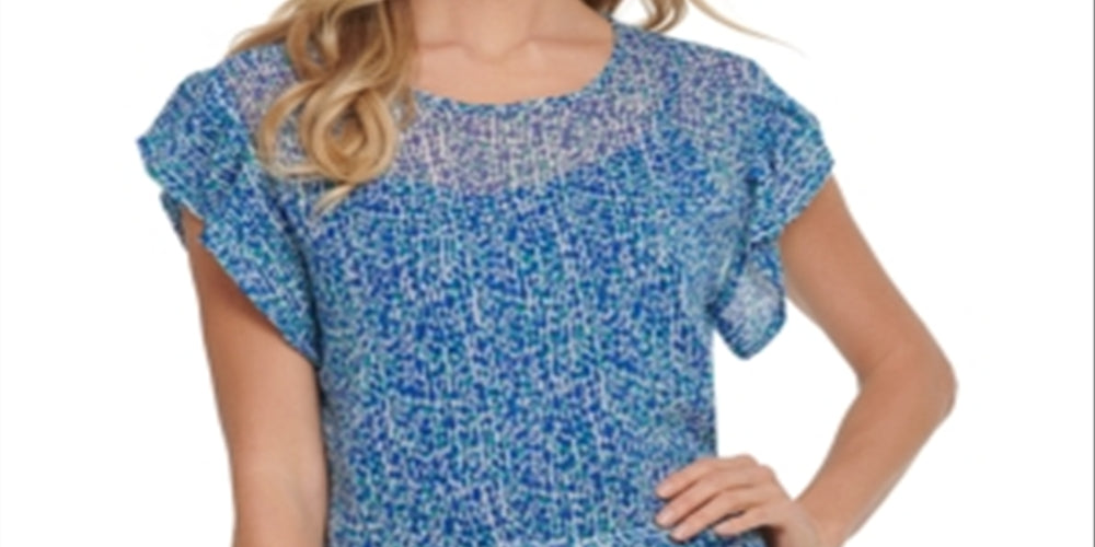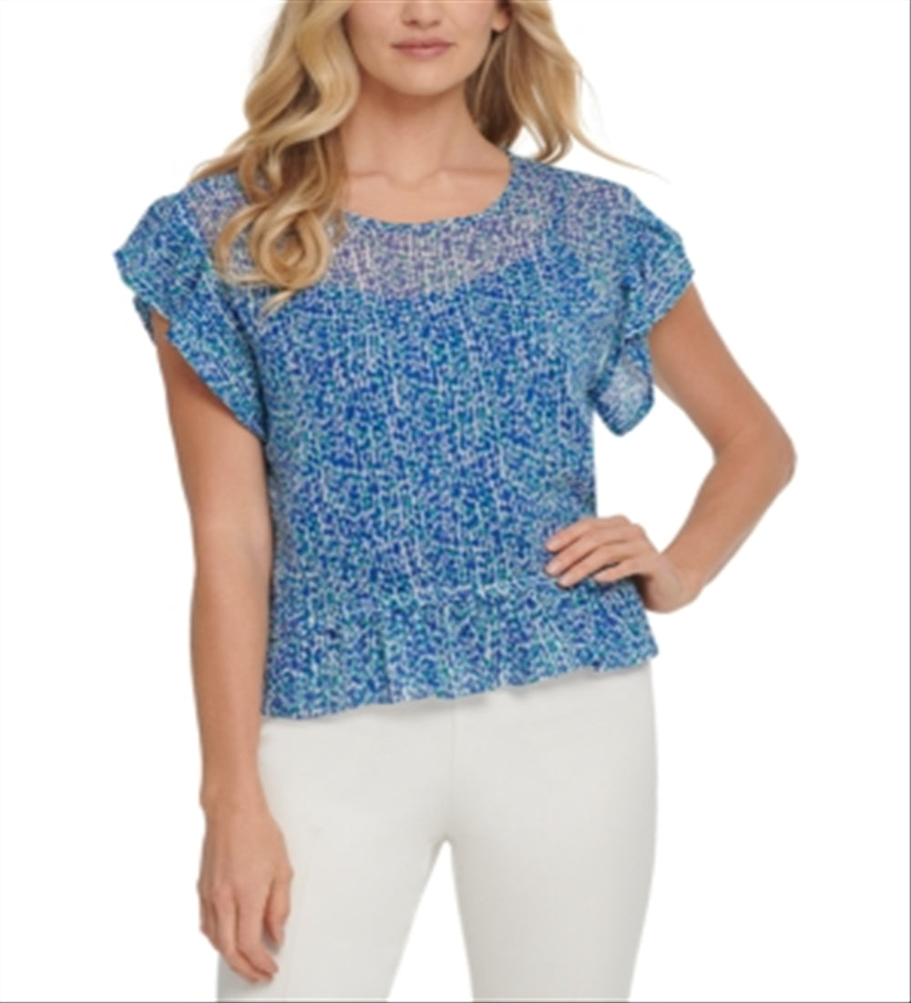 DKNY Women's Short Sleeve Printed Top With Ruffle Sleeves And Hem| Featuring an abstract print| this top by DKNY is accented with ruffle sleeves and hem for added dimension and movement