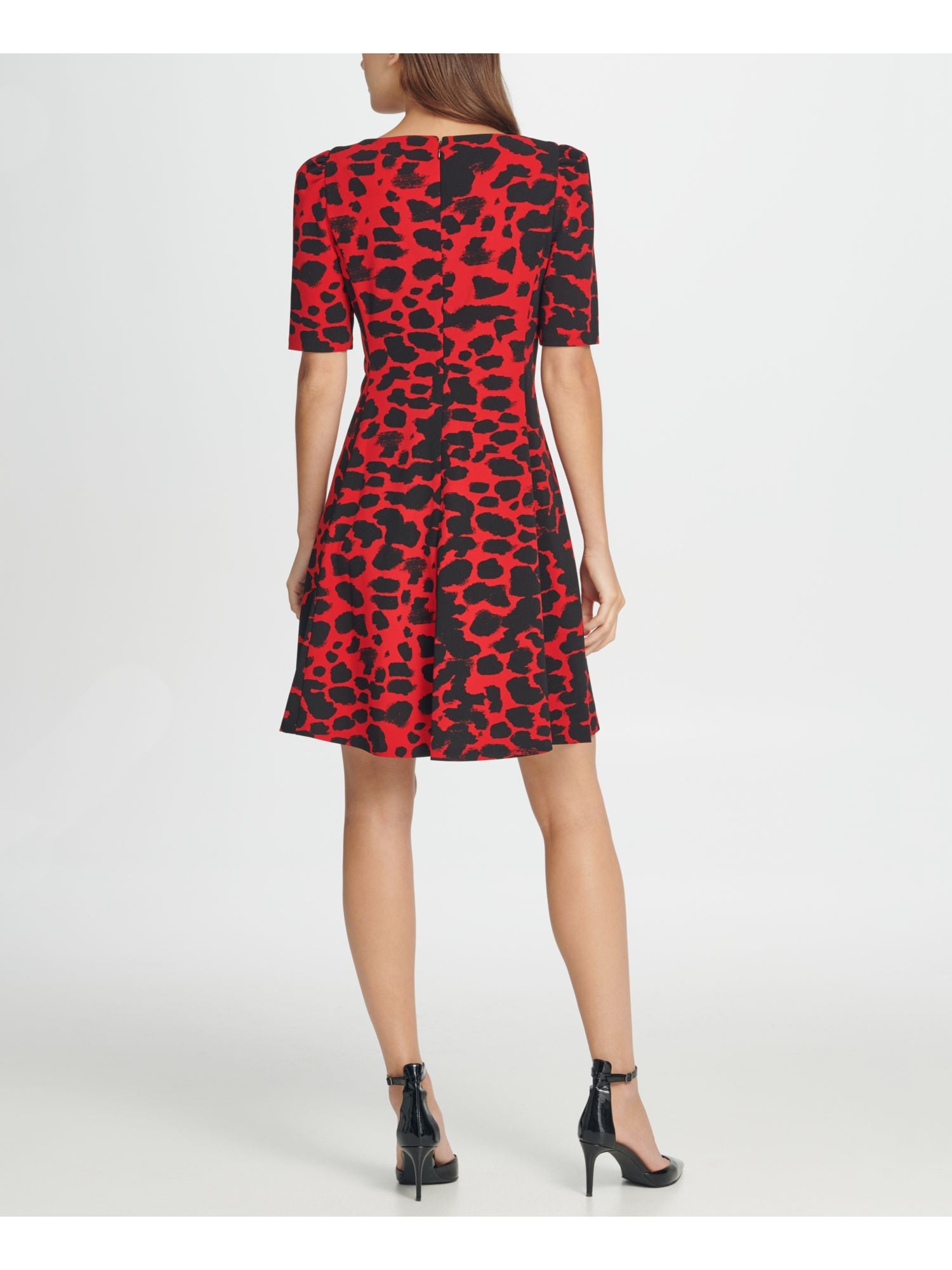 DKNY Women's Zippered Animal Print Short Sleeve Jewel Neck Above the Knee Fit Flare Dress Red Size 14
