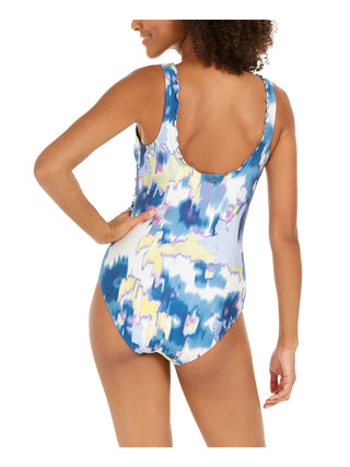 DKNY Women's Moire Floral Printed Ruffled One Piece Swimsuit Blue Size 16