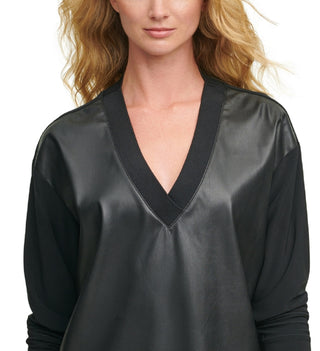 DKNY Women's Faux Leather Front V Neck Sweatshirt Black Size X-Large