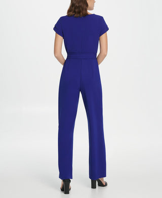 DKNY Women's Belted Short Sleeve Surplice Neckline Evening Straight Leg Jumpsuit Blue Size 2