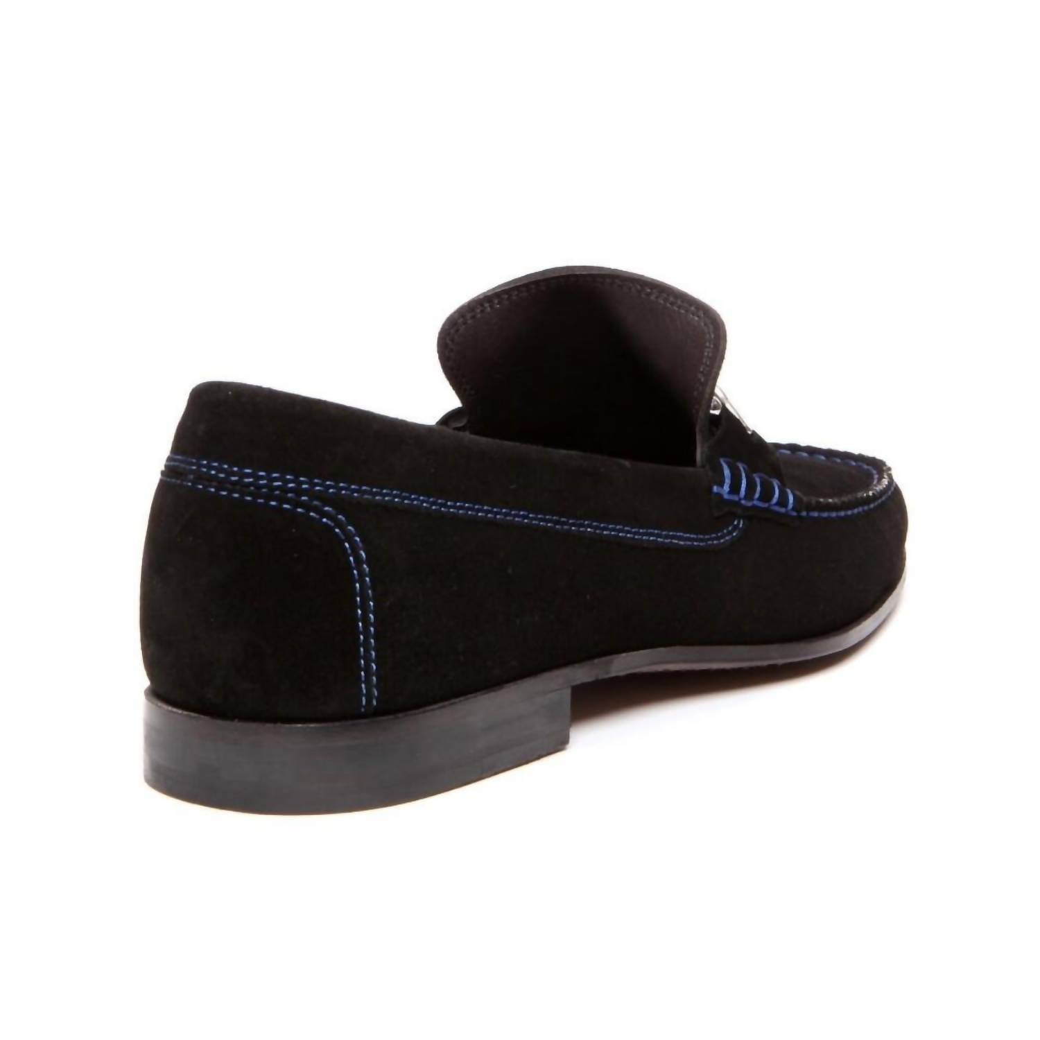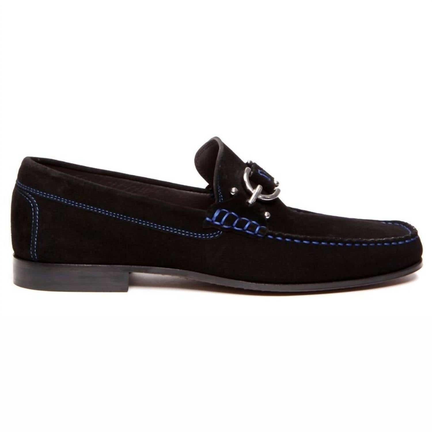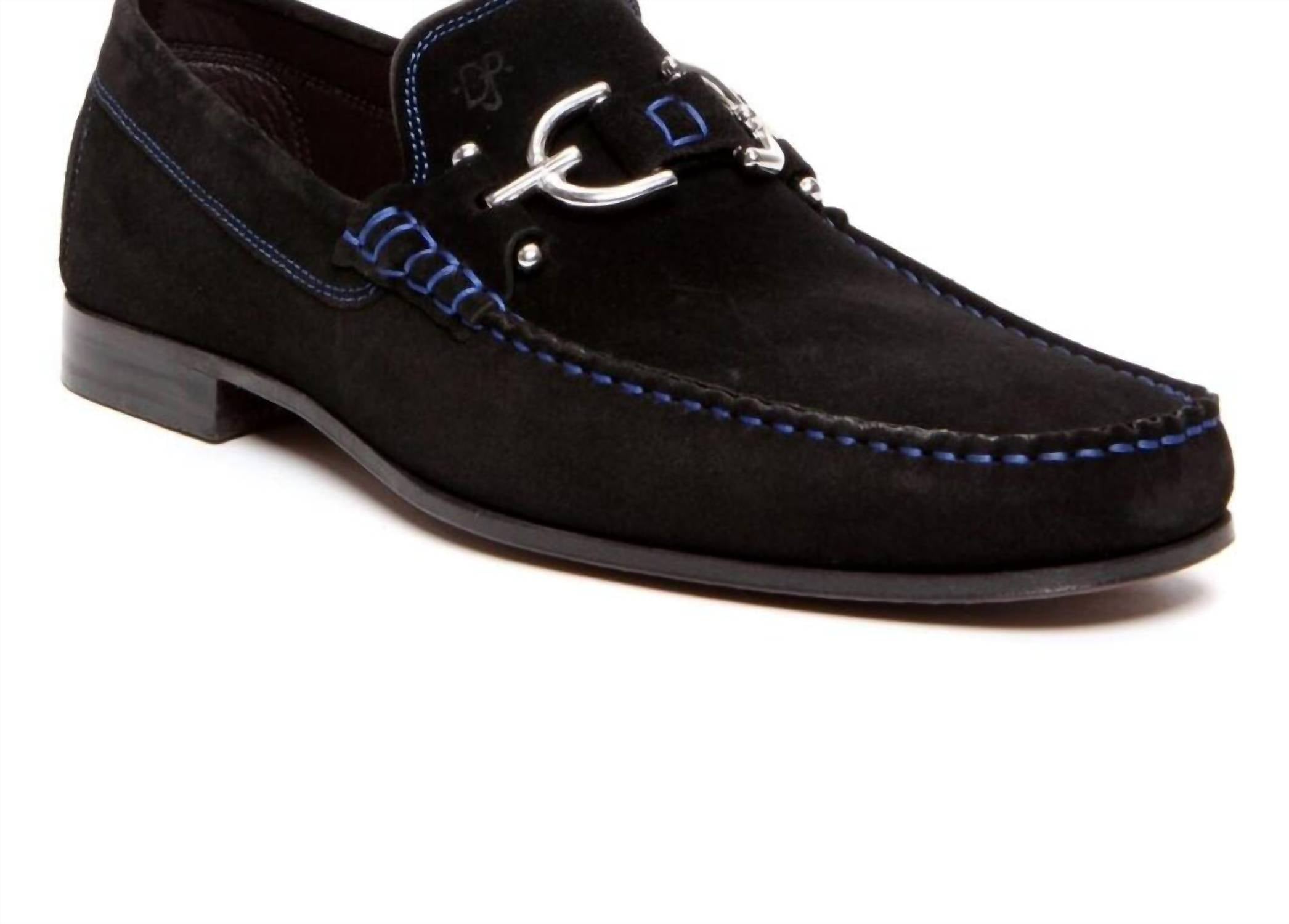 The Men's Dacio Loafer by Donald Pliner is a sophisticated staple for any man's wardrobe. This classic black suede loafer is enhanced by a brushed signature D ornament and contrast stitching for a touch of elegance. It features an almond toe and a flat heel under 1", crafted with a flexible buffed leather sole and a non-slip heel guard for comfort and stability. Proudly made in Italy, these loafers are perfect for any occasion.