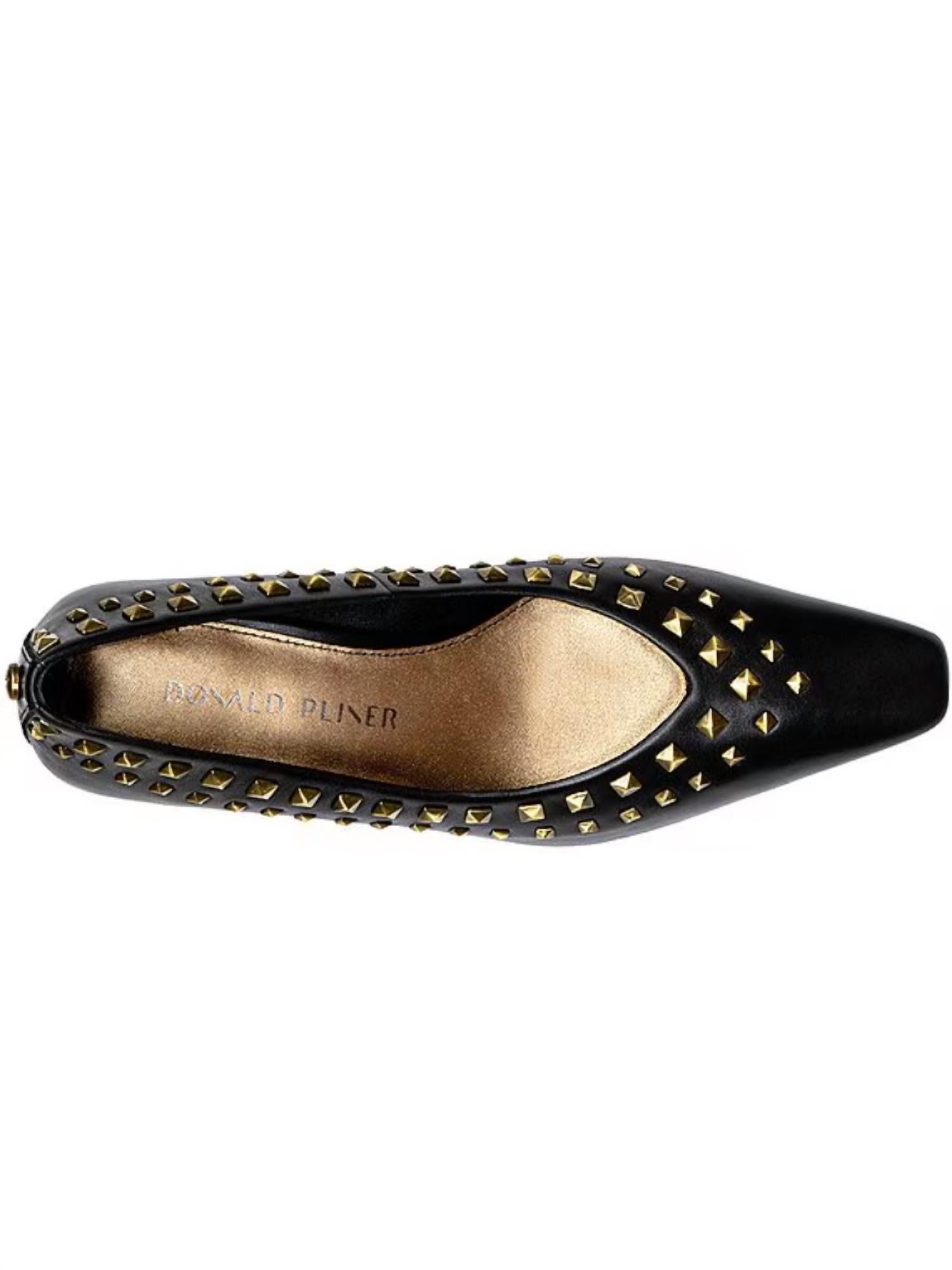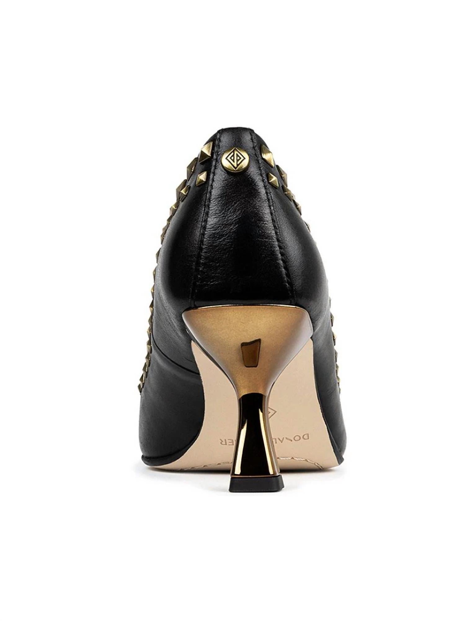 Pair these beauties with your favorite skinny jeans or dress for a night out on the town. Step into sophistication with the Bernice High Heels by DONALD PLINER, expertly crafted from sleek black calf leather. These women's heels feature a comfortable 2.5" spool heel and a pointed toe, ensuring a chic look for any evening event. With a memory foam insole and leather lining, they promise a luxurious feel, enhanced by a slightly elasticized topline for a perfect fit. Meticulously imported, these heels are defined by a brushed bronze pyramid stud accent and a metal-finished heel, epitomizing quiet luxury for the summer season.