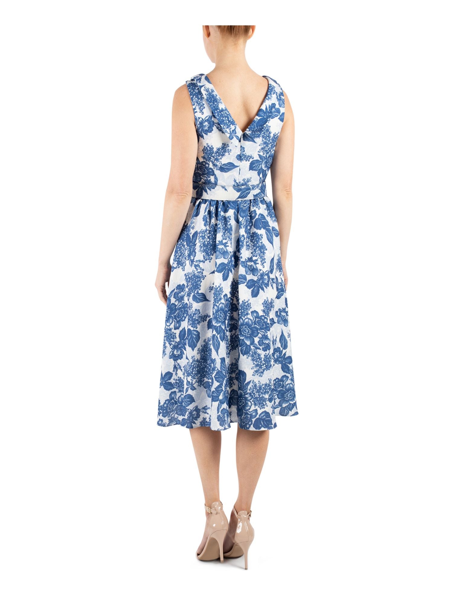 Pleated Design | Belted Waist | Zippered Closure | Lined Interior | Roll-Neck Style | Floral Print | Sleeveless | Below-Knee Length | Evening Fit + Flare Dress | Size 14