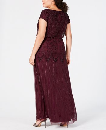 Blouson silhouette at bodice|Scoop neckline|Cap sleeves|Hidden back zipper with hook-and-eye closure|Allover mesh overlay with embellishments|Formal evening dress|Lined