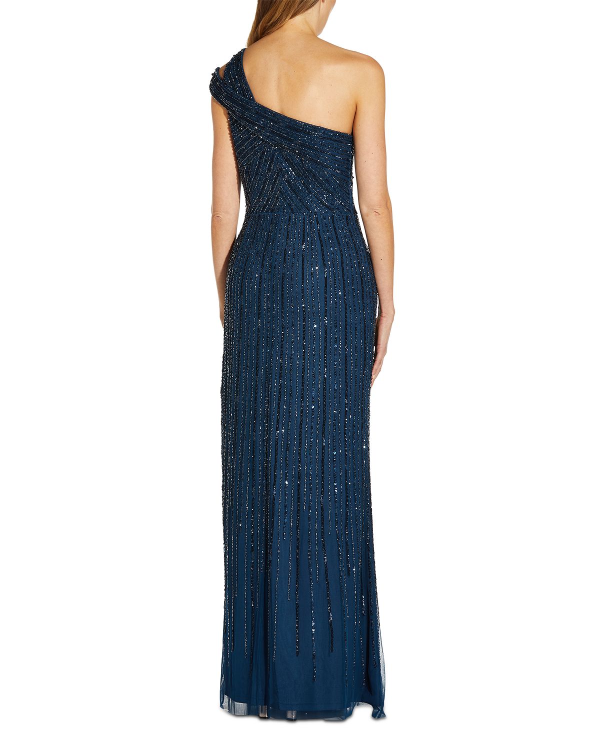 Beaded with linear luxe| this Adrianna Papell gown's one-shoulder strapping is cut out for a captivating touch. | Floor-length formal dress| Asymmetrical neckline; Gown silhouette| Zipper closure at side seam| Cutout at crossover shoulder strap| Multi-directional beaded embellishment