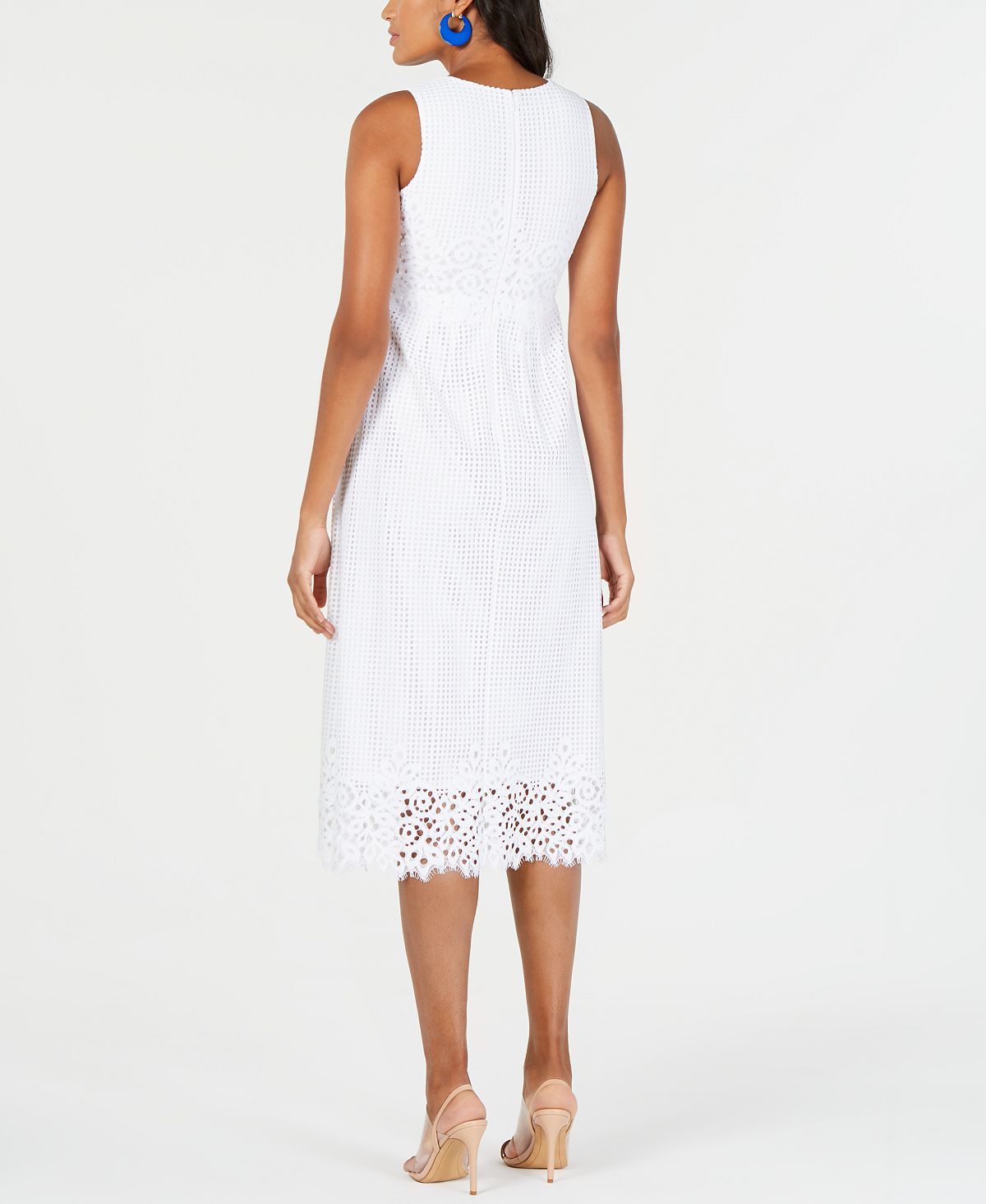 Scoop neckline| Back zipper with hook-and-eye closure| Allover geometric lace