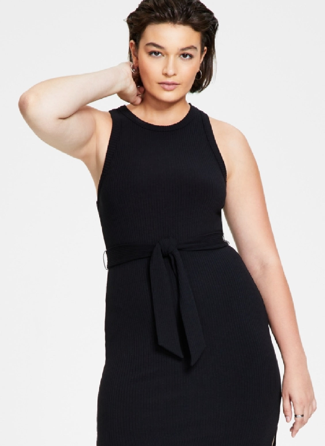Racer back; allover rib-knit; self-tie at waist; slits at sides|Imported|Pull-over style|Sleeveless|Crewneck; midi silhouette