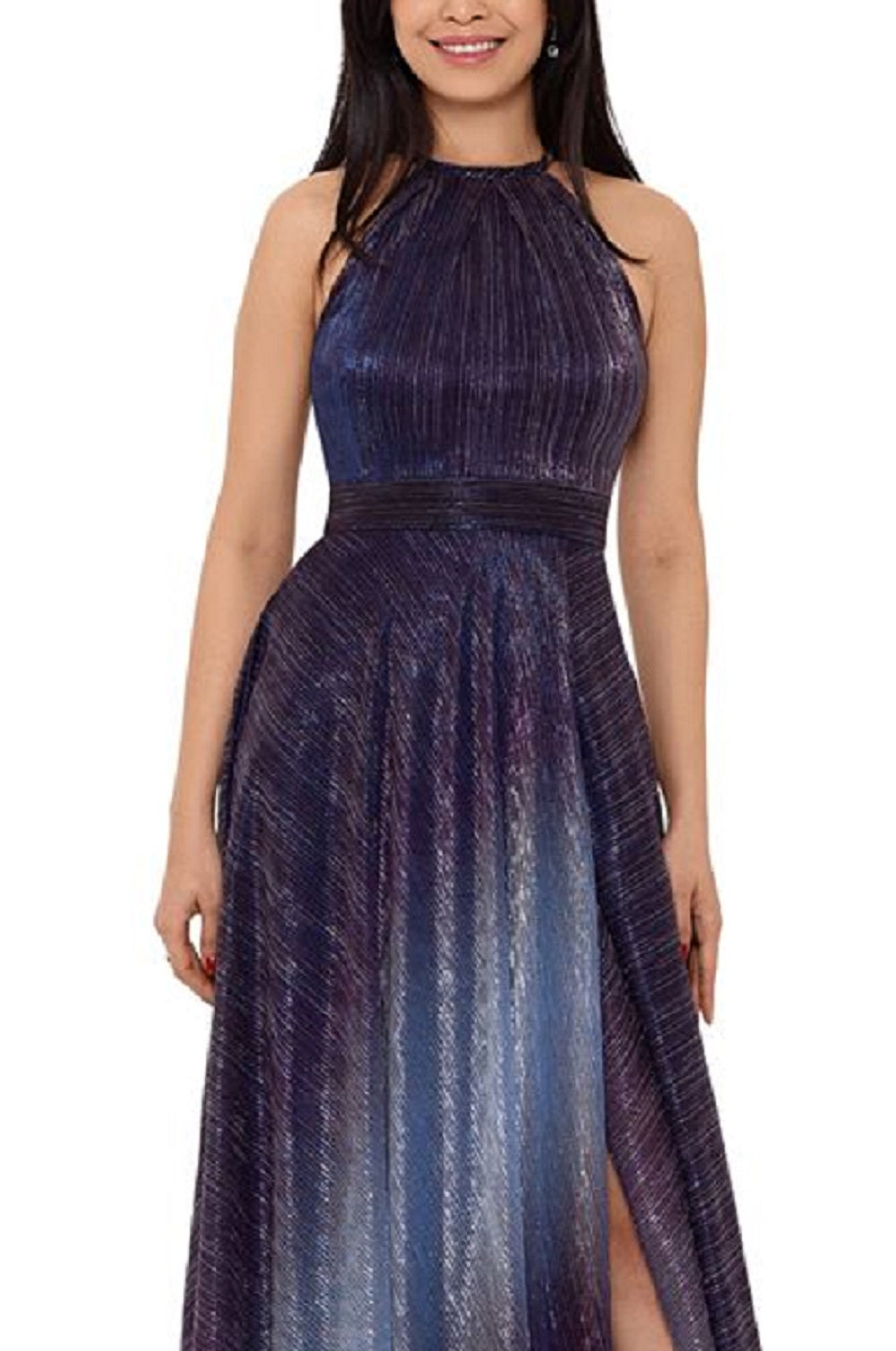 Be the star of the show in this ultra-glam metallic halter gown from Betsy & Adam.| Approx. 62-1/2 from center back neck to hem . Length is based on size 4 and varies 1/4 between sizes| Halter neckline; Gown silhouette | Back zipper with hook-and-eye closure| Slit at front hem| IMPORTANT NOTE; This item arrives with a return tag attached and instructions for removal. Once the tag is removed from the dress| this item cannot be returned.