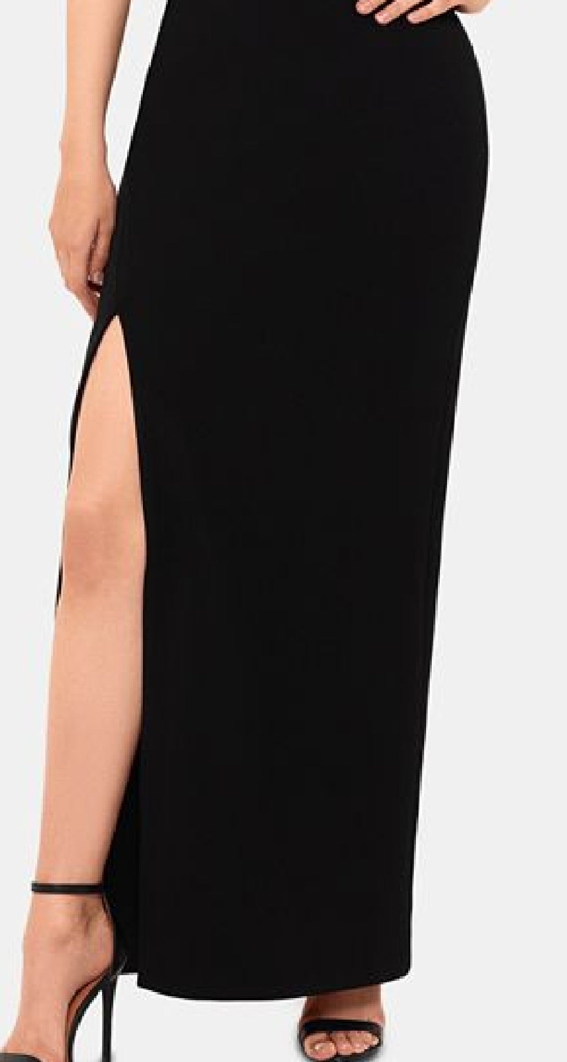 Betsy & Adam balances this evening gown beautifully with a daring leg slit on one side and two elegant shoulder straps at the other. It's so sophisticated and perfect for your next black-tie affair. | Approx. 60 long from center back neck to hem. Length is based on size 4 and varies 1/8 between sizes| Asymmetrical neckline; Gown silhouette| Back zipper closure| Double one-shoulder strap | High leg slit