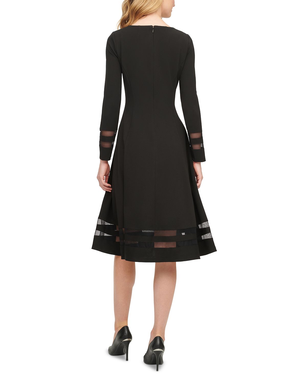 Stripes of illusion mesh add modern interest to this scuba-crepe A-line dress from Calvin Klein.| Approx. 41-1/2 long from center back neck to hem. Length is based on size 6 and varies 1/4 between sizes| Round neckline; A-line silhouette| Back zipper closure| Illusion mesh insets at sleeves and hem| Unlined