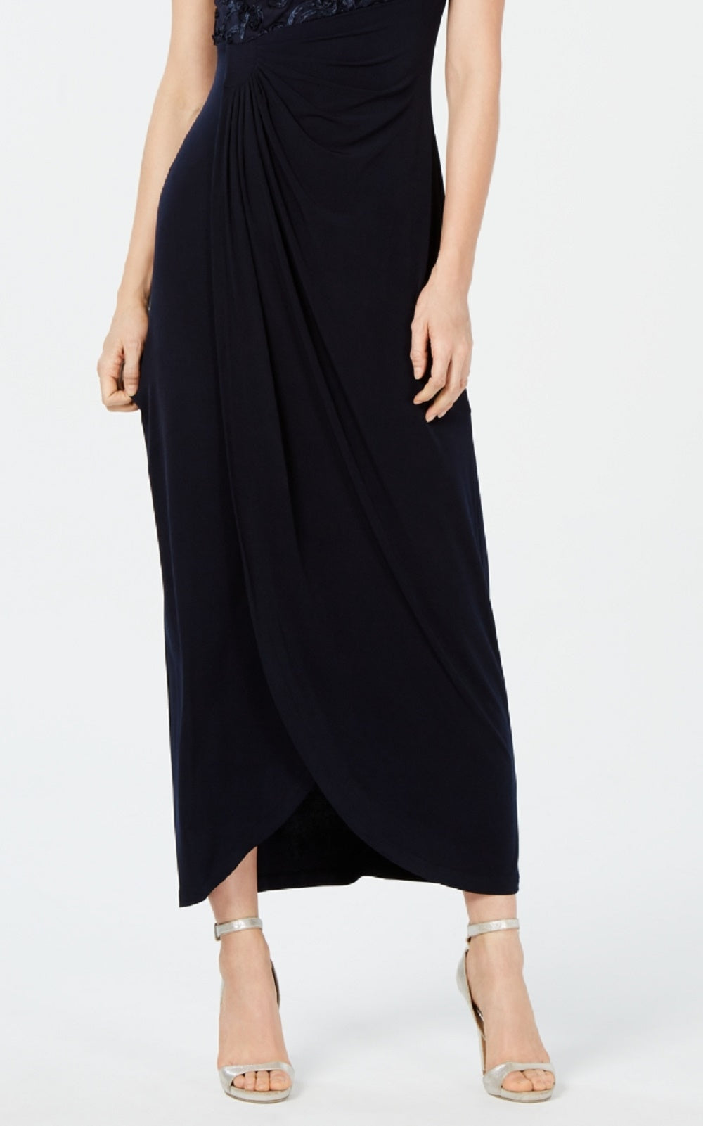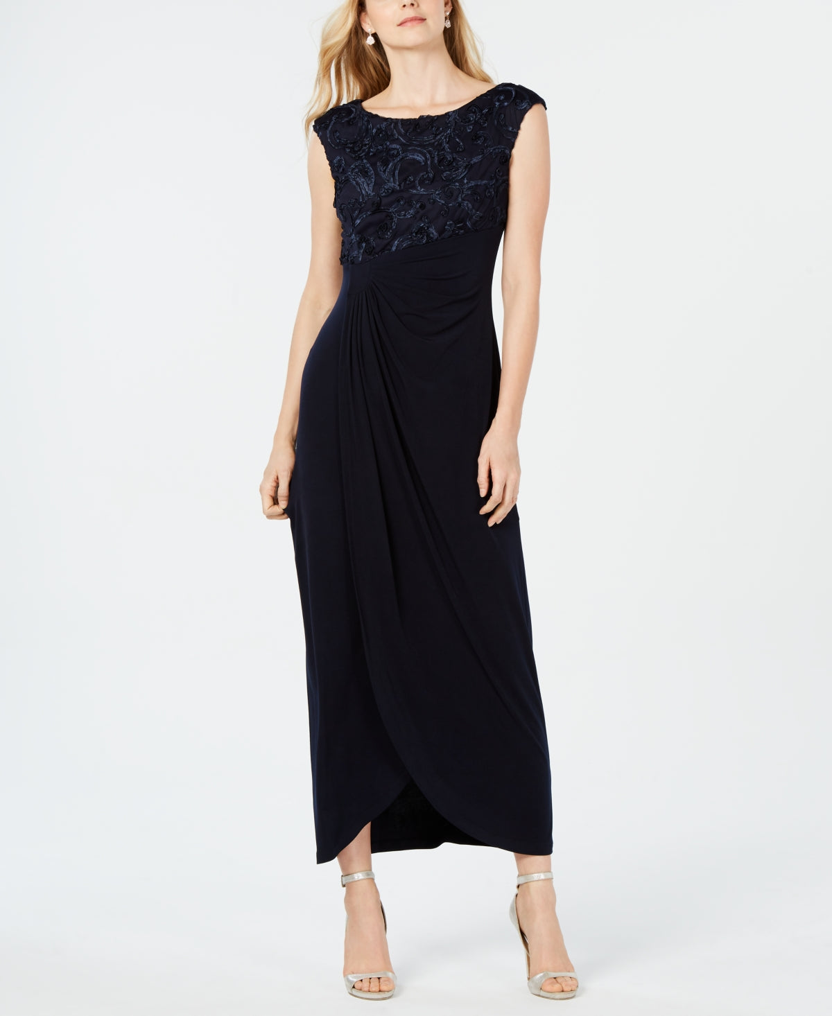 Luxurious soutache trim lends a high-style look to the bodice of this elegant petite faux-wrap gown from Connected.| Unlined| Round neckline; gown silhouette| Pull-on styling| Soutache trim at bodice; faux-wrap skirt; ruched at side| Imported|