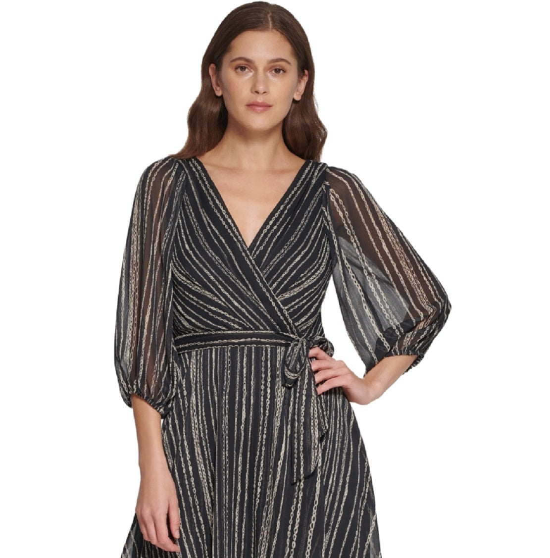 DKNY Women's Printed Chiffon Balloon Sleeve Wrap Midi Dress Black Size 6