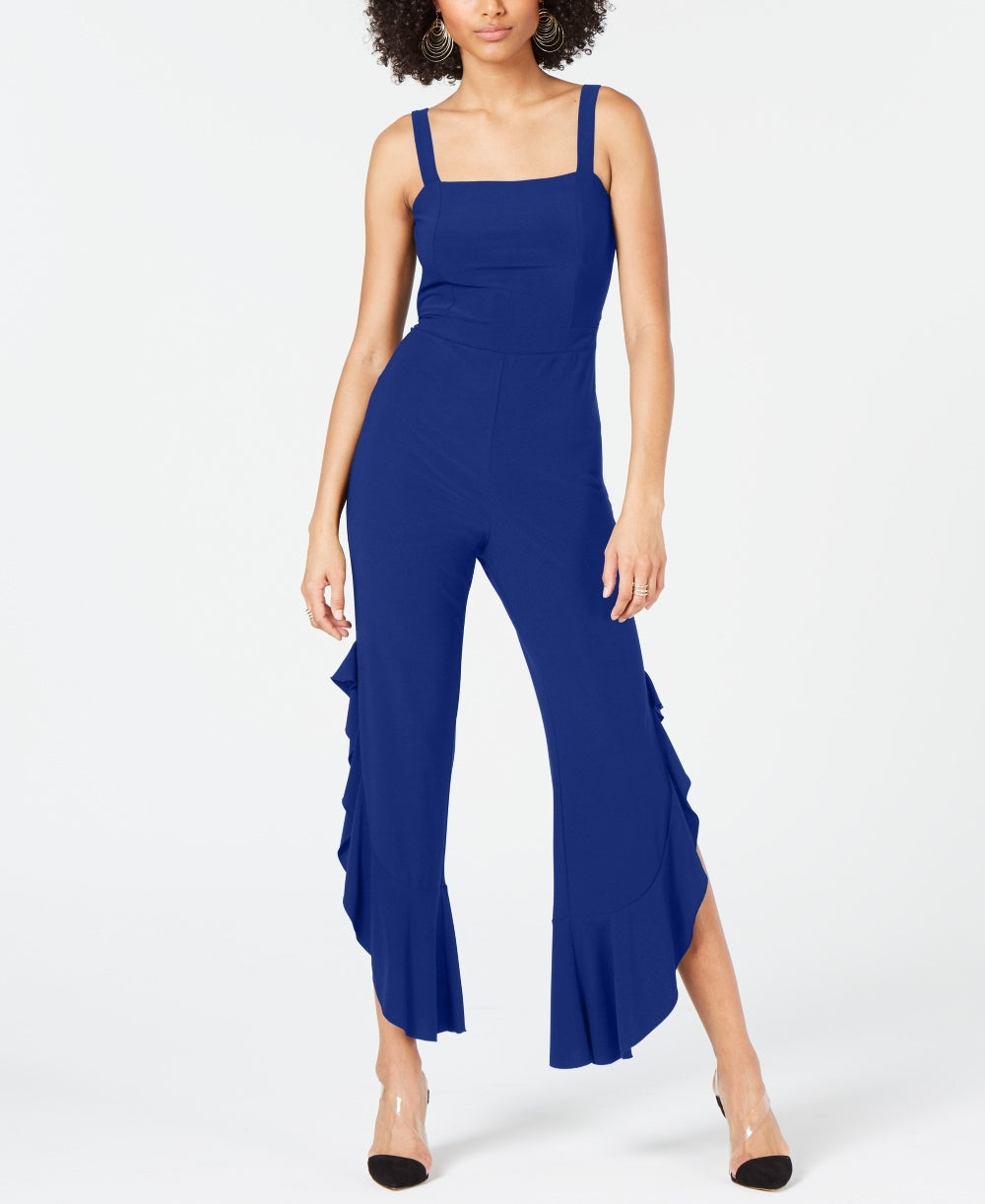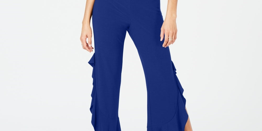 Approx. inseam; 27.5|Front rise approx. 9; back rise approx. 15; wide leg|Square neckline; zipper closure at back|Ruffled hem
