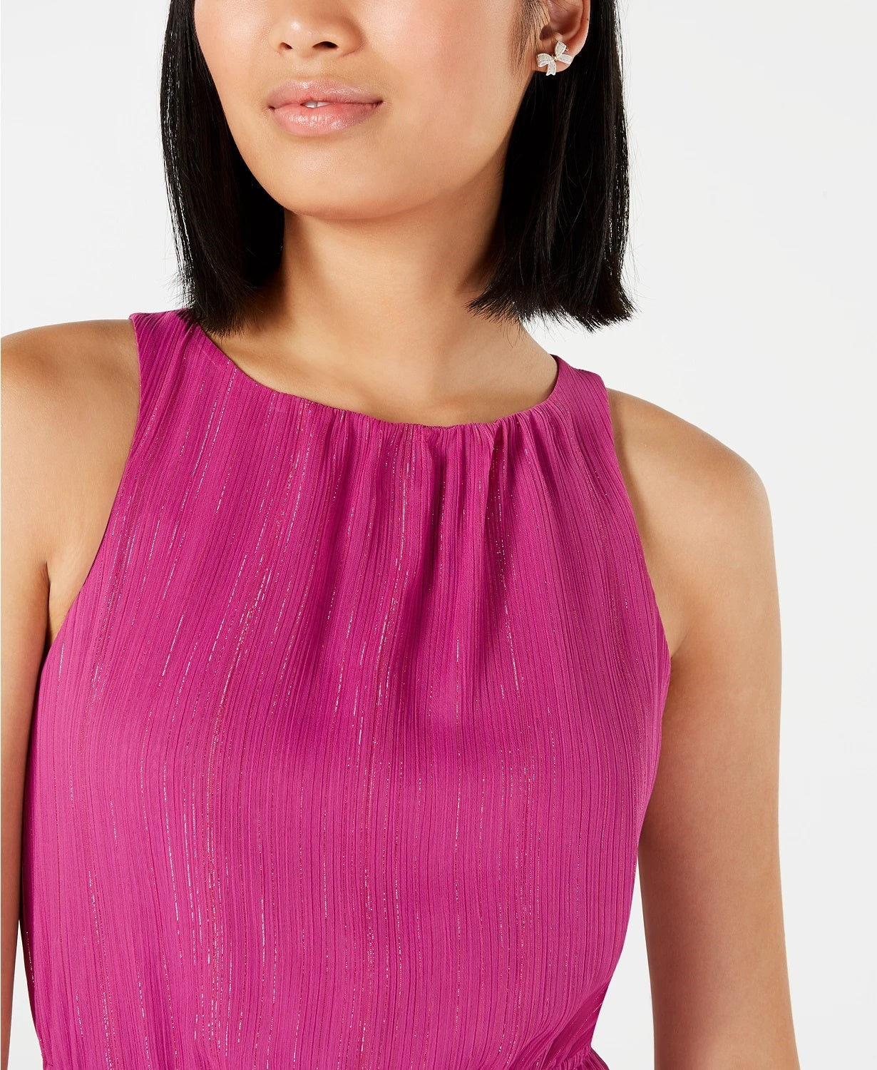Approx. 36" long from center back neck to hem.|Crew neckline; shift silhouette|Back keyhole with button closure|Chiffon overlay; metallic threading; elasticized waistline