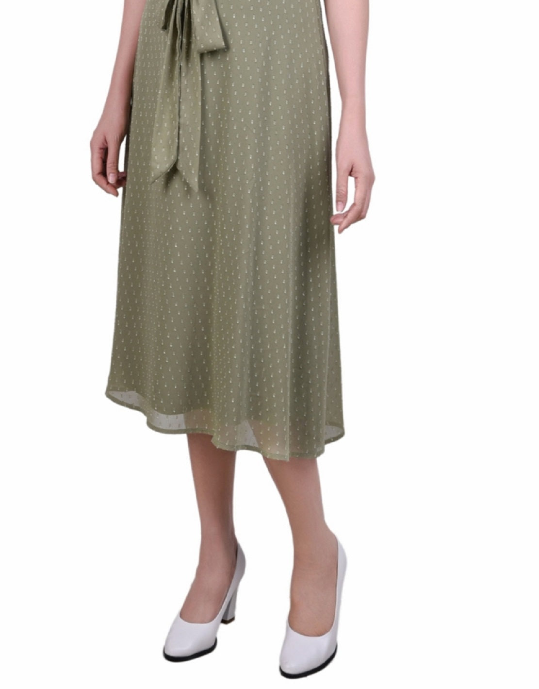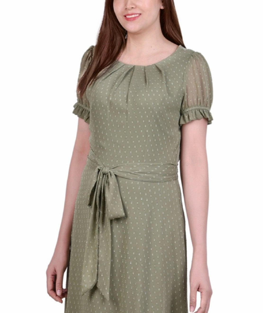 NY Collection presents this sweet and simple Swiss dot dress| with a tie waist and ruched sleeves for the perfect special occasion dress
