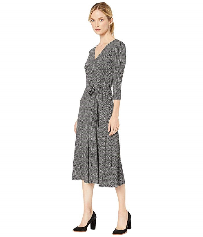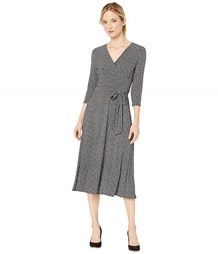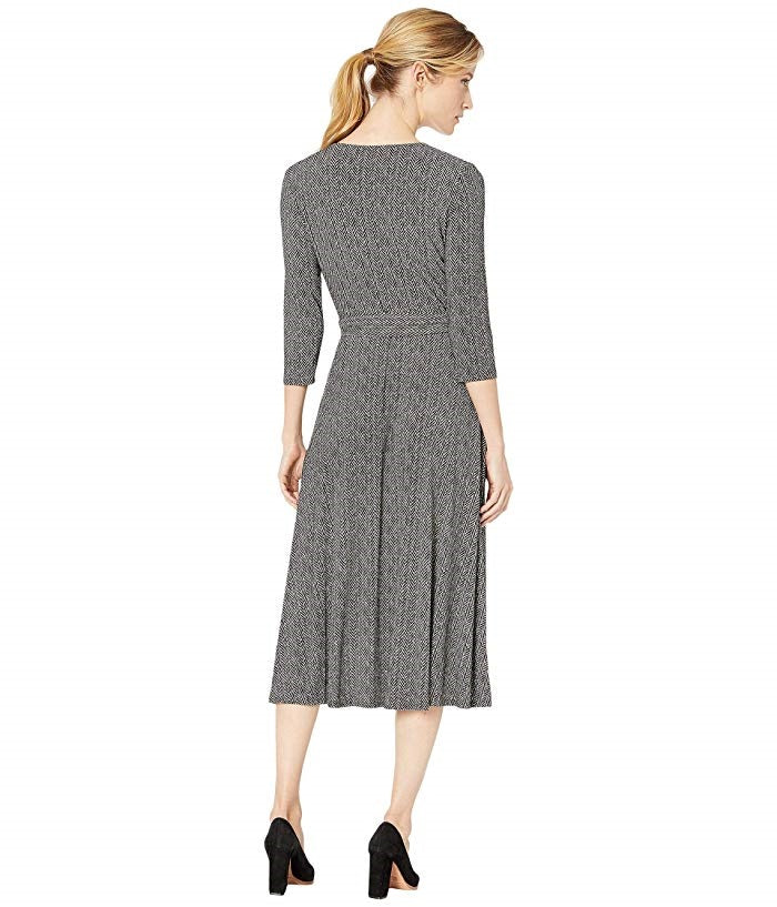 Ralph Lauren Women's Black Tie Herringbone 3/4 Sleeve V Neck MIDI Faux Wrap Party Dress Black Size 6