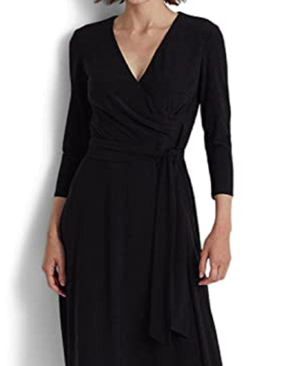 Take your style to the next level with this Ralph Lauren Jersey-Matte Midi Dress| It features a wrap-inspired silhouette and a solid jersey-matte fabrication| ; Three quarter sleeve length dress with a V-neckline in a sheath silhouette| ; Day dress with a V-neckline and three-quarter sleeves| ; Matching self-ties at waist| ; Straight hemline falls at midi length| ; Wrap-style design at the front