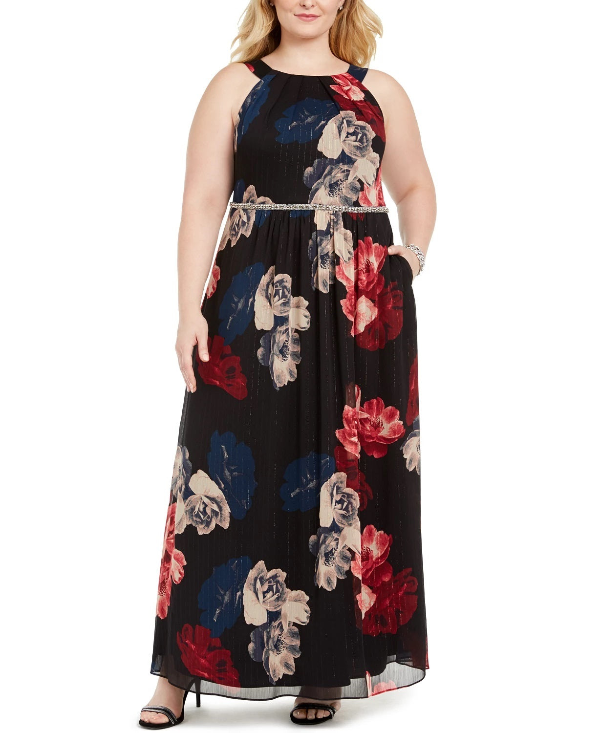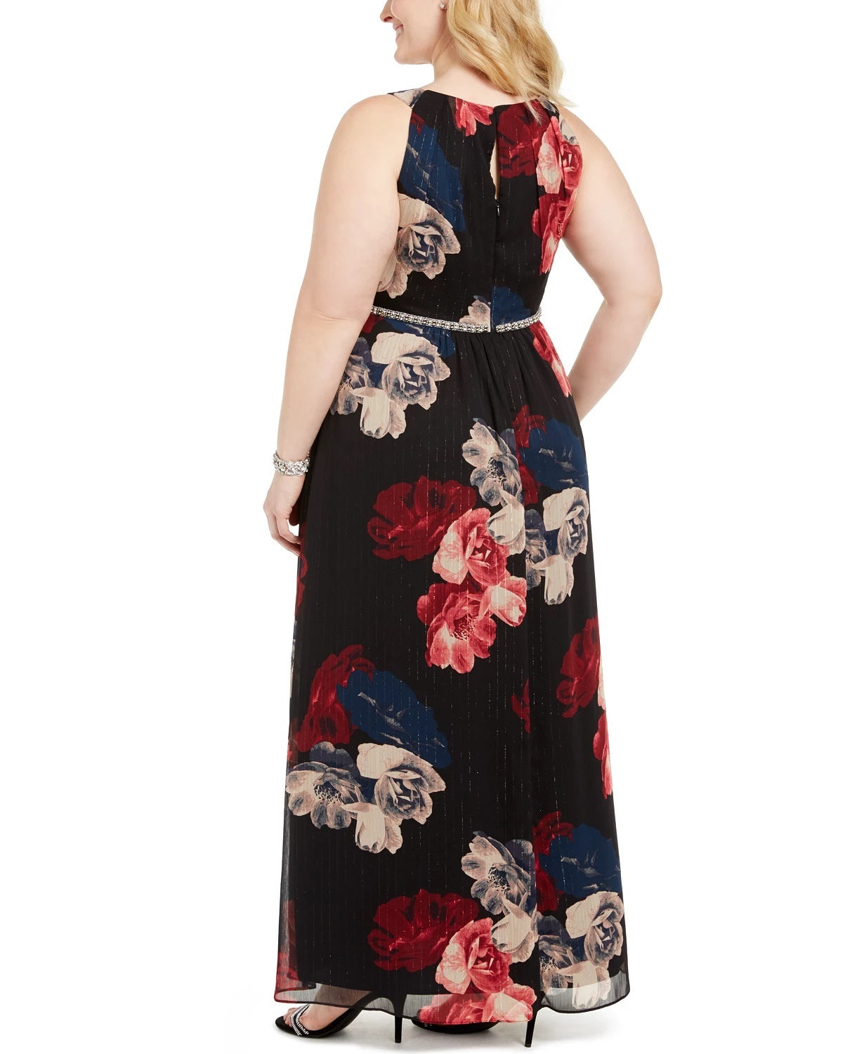 Approx. 56" long from center back neck to hem. Length is based on size 18W and varies 1/4" between sizes|Halter neckline; Maxi silhouette|Hidden back zipper with hook-and-eye closure|Floral; silver-tone beaded embellishment at waist; center back keyhole with button closure|IMPORTANT NOTE: This item arrives with a return tag attached and instructions for removal. Once the tag is removed from the dress, this item cannot be returned.