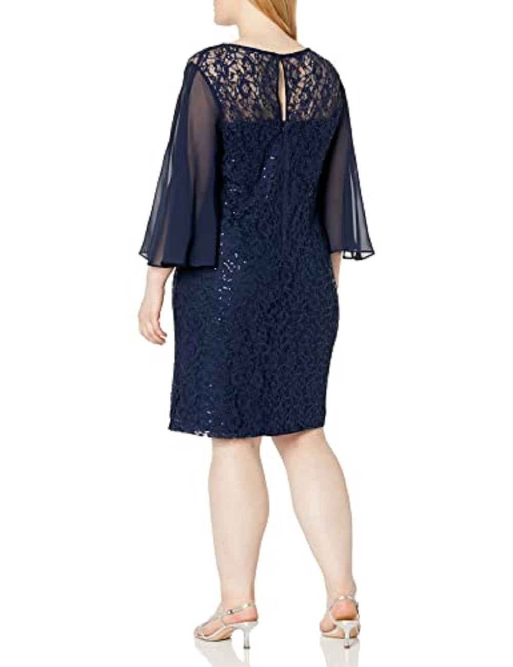 Flowy sheer sleeves frame the sparkly sequined lace of this SL Fashions plus size sheath| Its mix of textures is a perfect match for a wedding guest or mother of the bride or groom