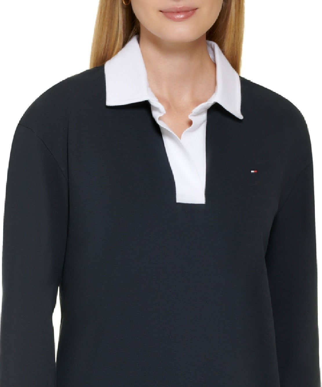 Tommy Hilfiger's sporty chic long sleeve dress is topped off with a stylish contrasting Johnny collar. | Long sleeves| Embroidered flag at chest | Pullover styling| Imported| Johnny collar |