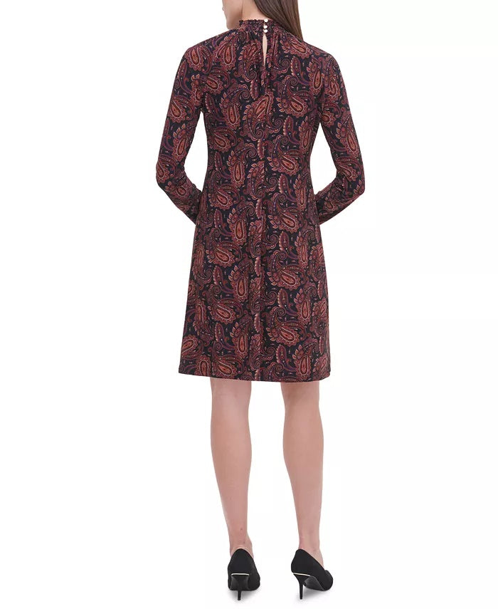 Approx. model height is 5'10" and she is wearing a size 4|Approx. 35-3/4" long from center back neck to hem. Length is based on size 4 and varies 1/4" between sizes|Mock neckline; A-line silhouette|Hidden back zipper with hook-and-eye closure|Unlined|Polyester/spandex|Dry clean