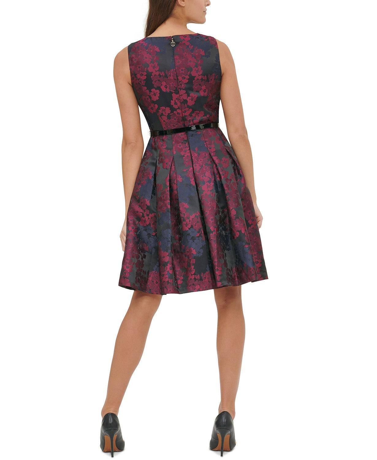 Approx. model height is 5'10" and she is wearing a size 4 | Approx. 37-1/2" long from center back neck to hem. Length is based on size 4 and varies 1/4" between sizes | Designed to fit and flatter 5'4" and under frame | Crewneck; Fit & flare silhouette | Hidden back zipper closure | Faux-leather belt; textured finish | Shell, lining: polyester; belt: polyurethane | Dry clean | Imported