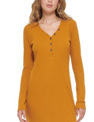 DKNY Women's Henley Neckline Long Sleeve Ribbed Dress Brown Size X-Large