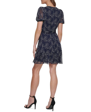 DKNY Women's Embroidered Faux Wrap Sheer Sleeve Dress Blue Size 2